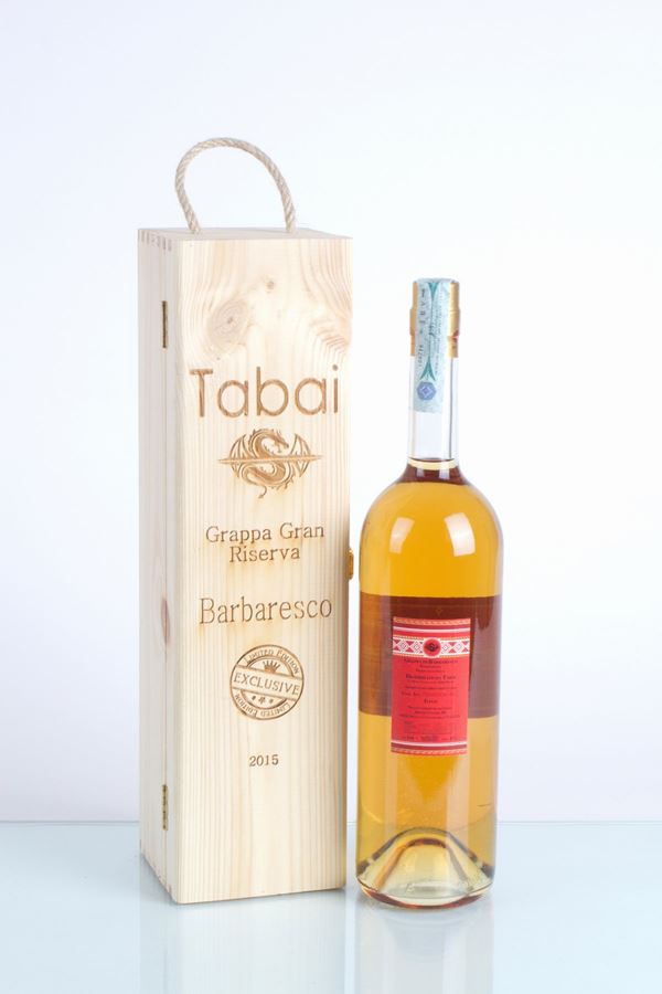 Una bottiglia di Tabai Grappa di Barbaresco Gran Riserva Cuvée 2015. Invecchiata in barrique di rovere. Limited Edition Exclusive. Cofanetto originale.