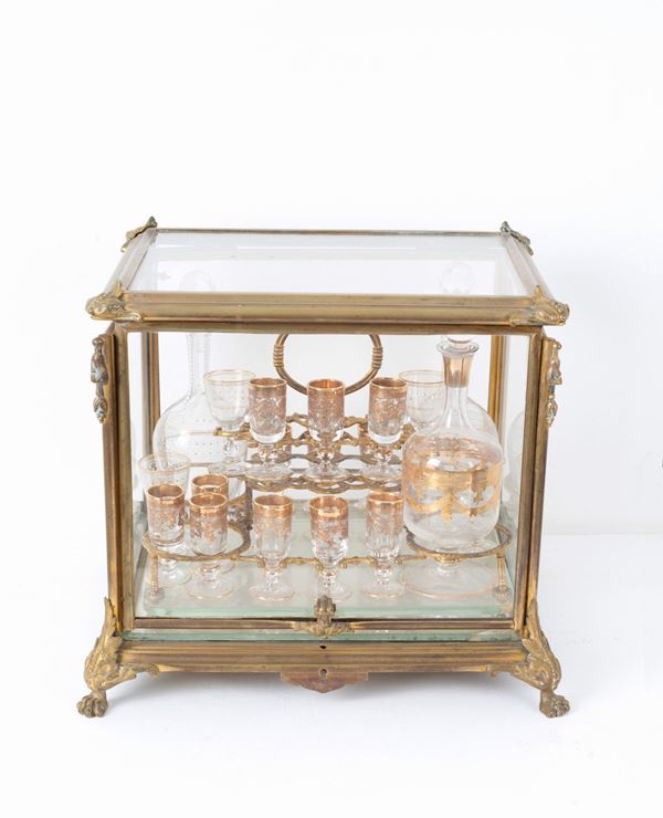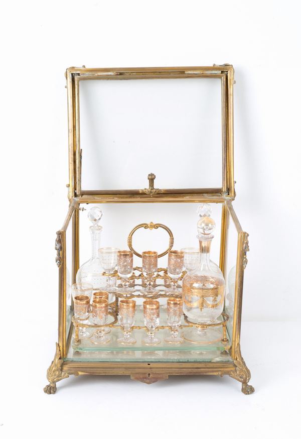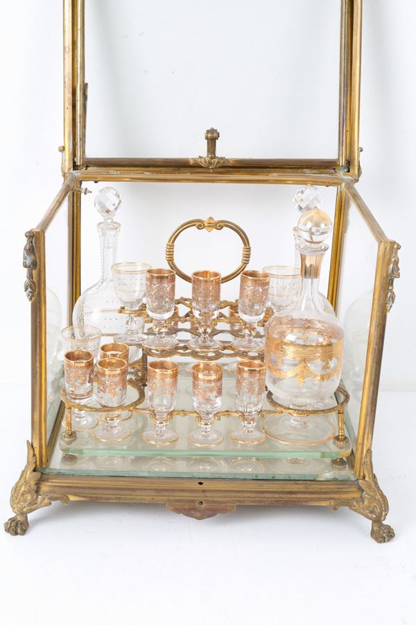 Tantalus in vetro e bronzo dorato contenente tre bottiglie e sedici bicchierini in cristallo con finiture dorate. Mancante di una bottiglia. Difetti.