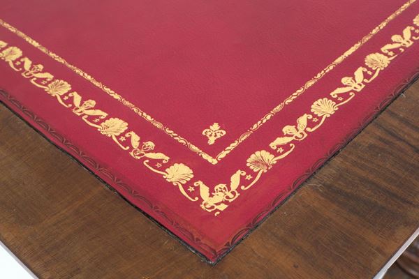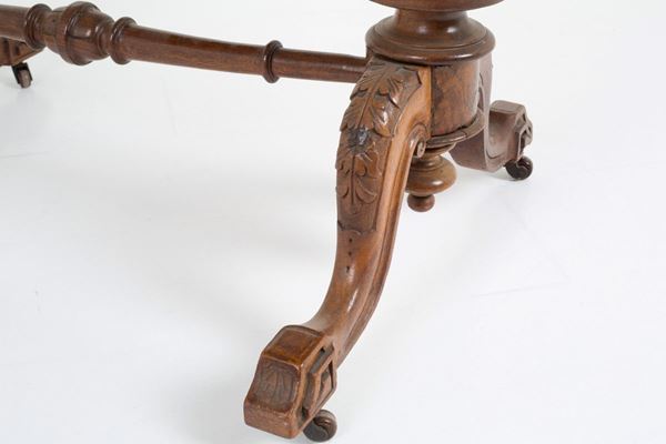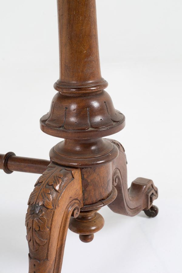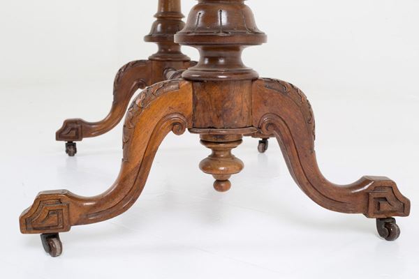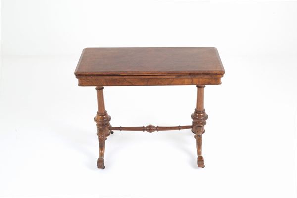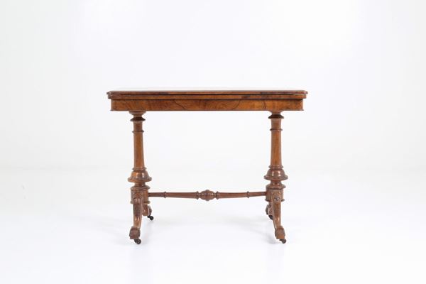 Tavolino da gioco in legno di carrubo e noce con piano apribile parzialmente rivestito in pelle e rotelle ai piedi. XIX secolo. Lievi difetti.