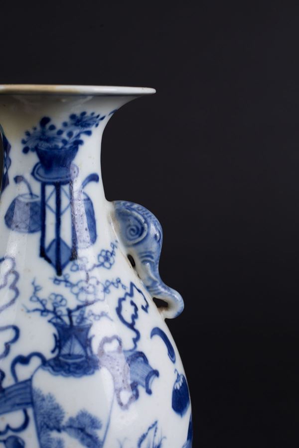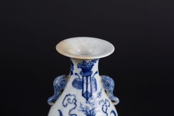 Vaso in porcellana bianca e blu. Cina. Restauri alla bocca.