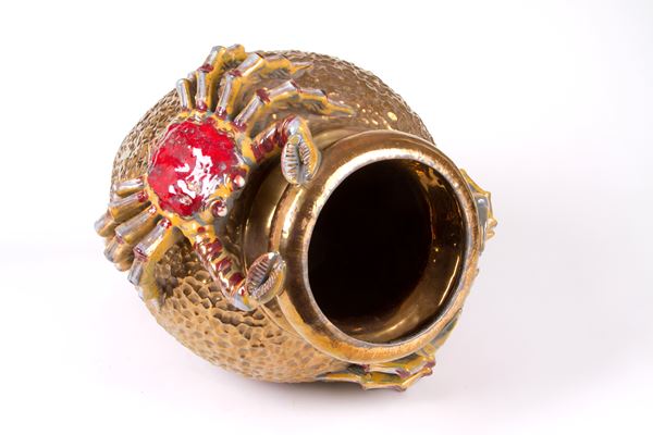 Vaso in ceramica oro con granchi applicati. XX secolo.