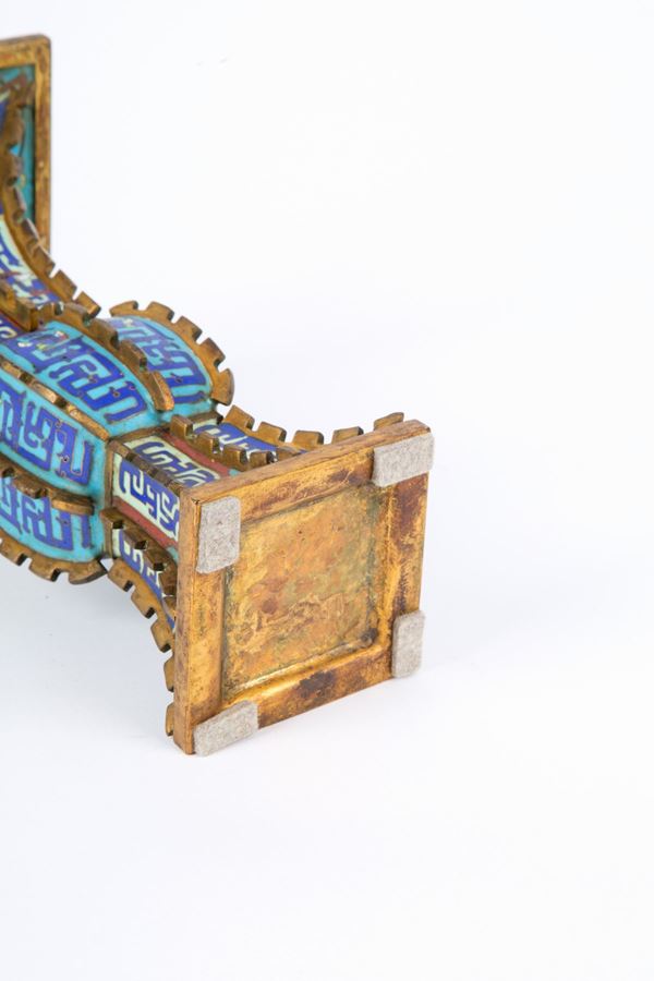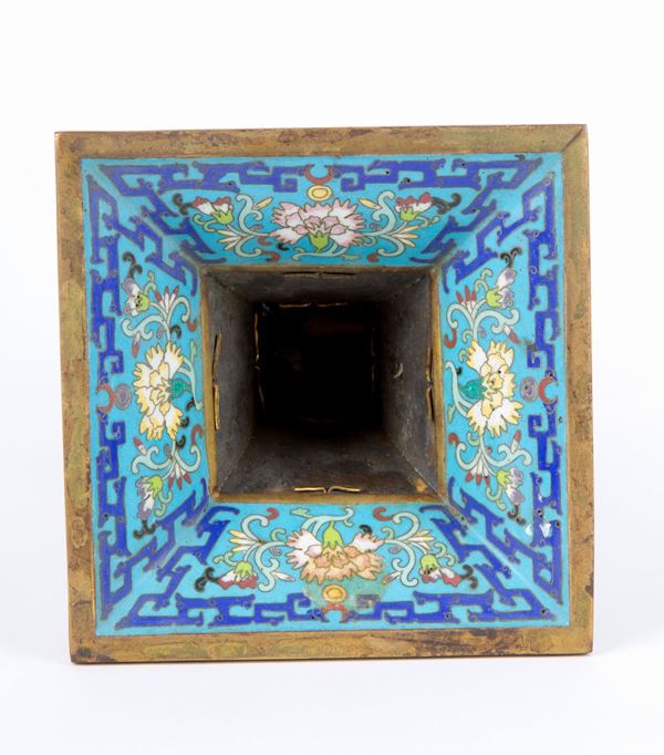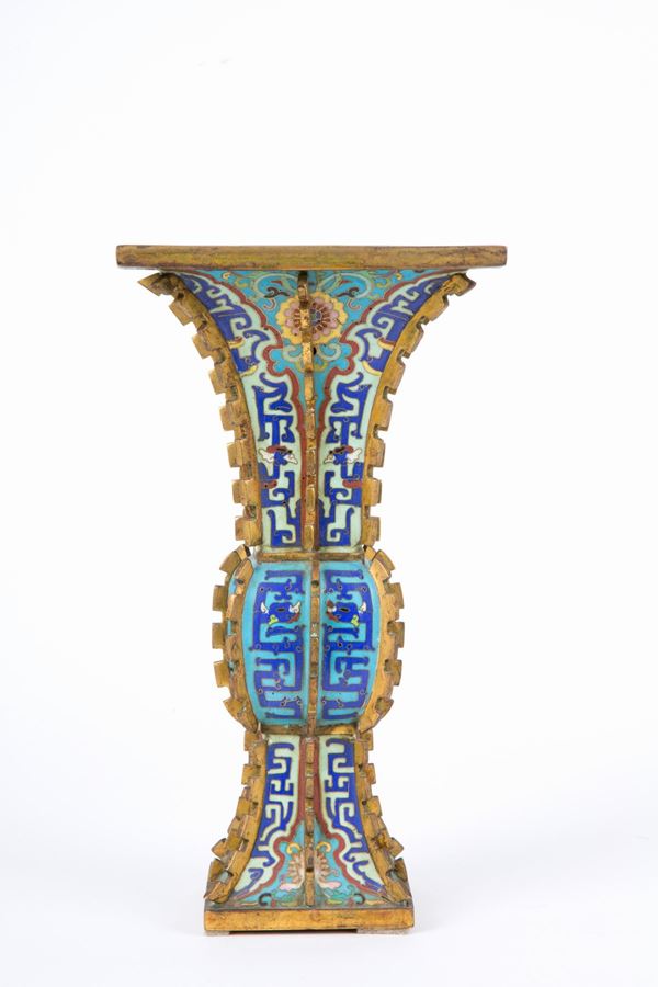 Vaso cloisonné con profili in bronzo dorato. Cina.