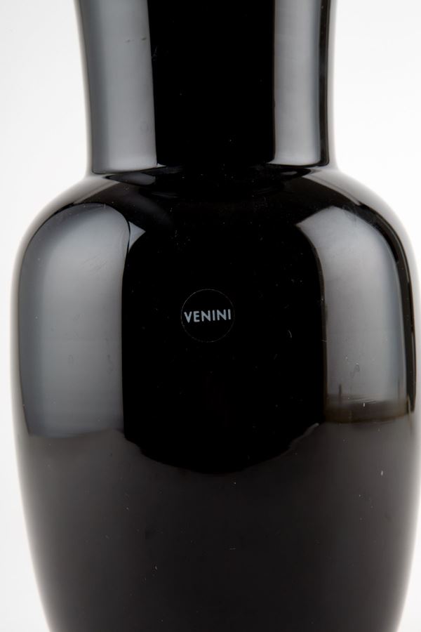 Vaso Opalino in vetro di Murano nero. Produzione VENINI. Con etichetta del produttore sul lato. Firmato e datato 2008 sul fondo.