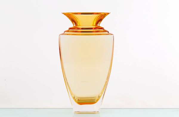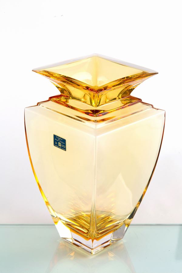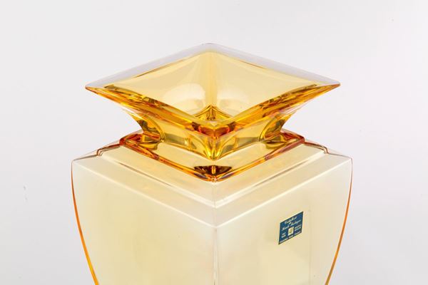 Vaso a sezione quadrata in vetro soffiato color ambra. Manifattura CRISTALLERIE DE HAUTE BRETAGNE. Marchio all'acido sul fondo. Con etichetta e certificato di autenticità.
