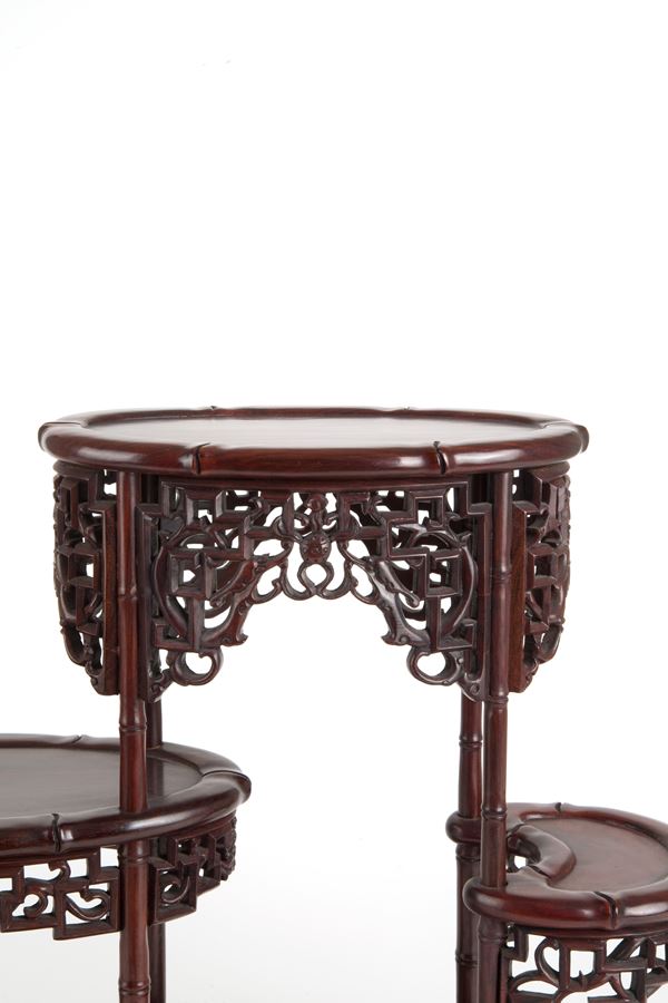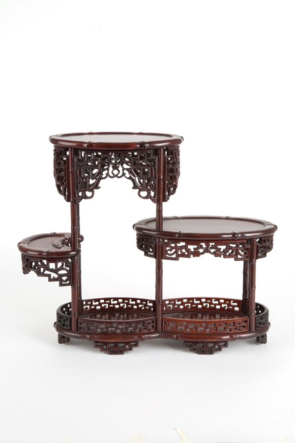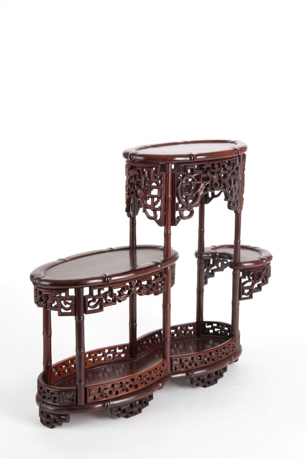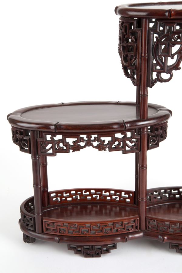 Mobile portaoggetti su più livelli in legno finemente intagliato. Cina. Inizi XX secolo.