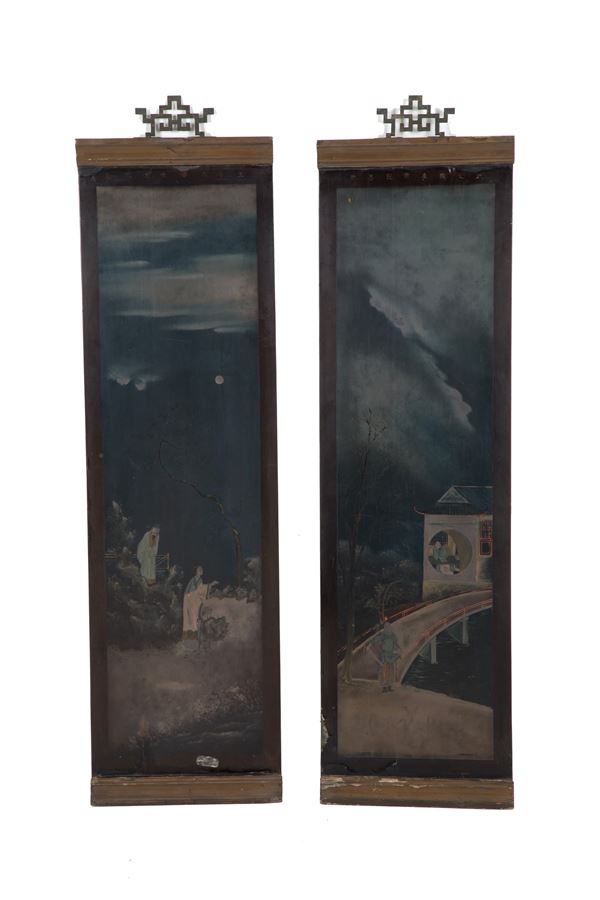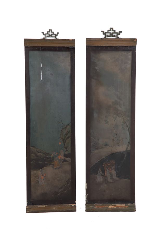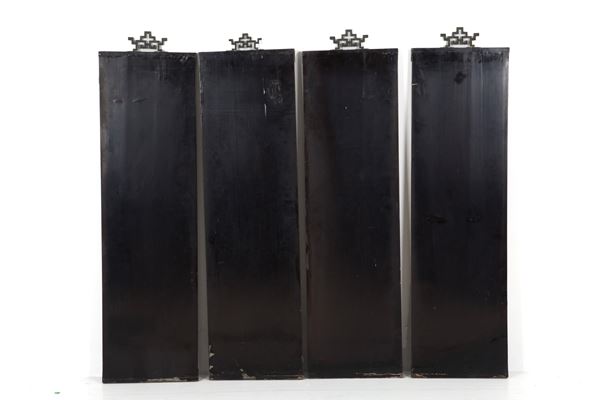 Quattro pannelli in legno laccato raffiguranti "PAESAGGI". Cina. XIX secolo. Difetti.