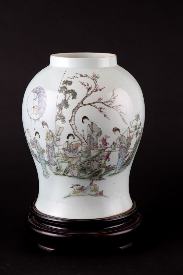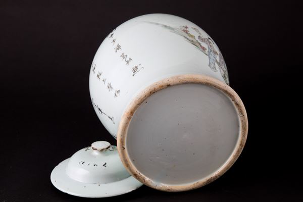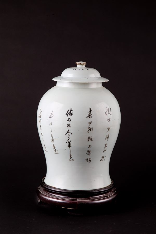 Vaso con coperchio in porcellana bianca con scene di vita orientale e scritte. Base in legno. Cina. Fine XIX secolo.