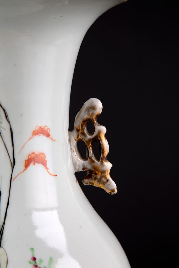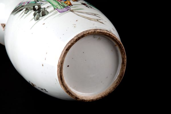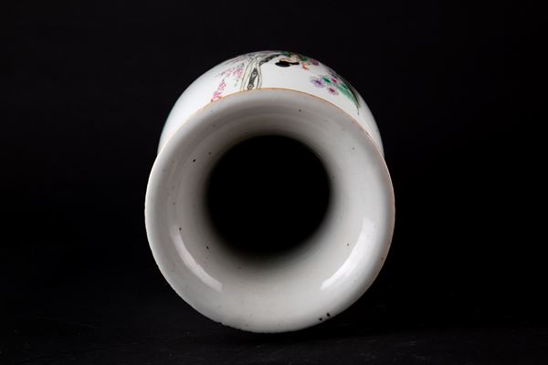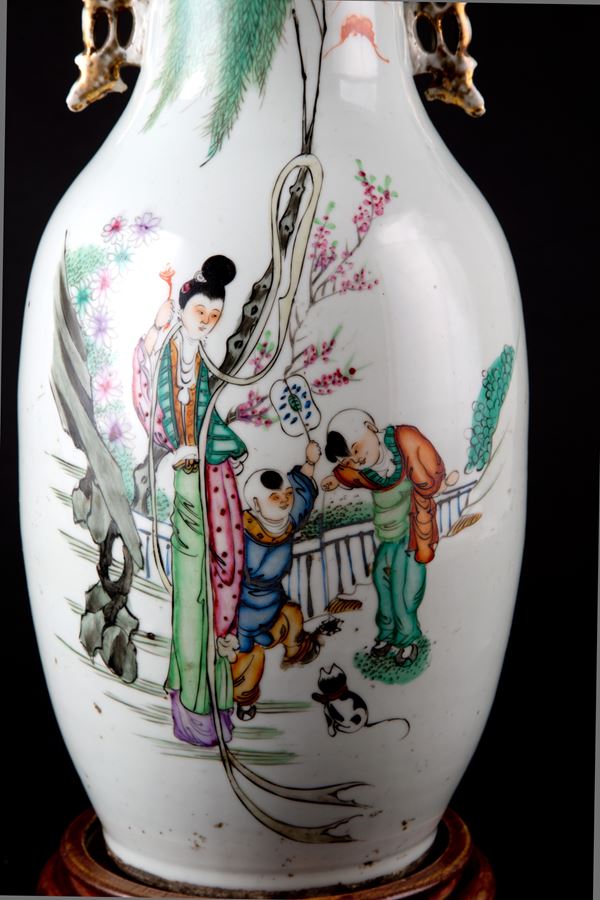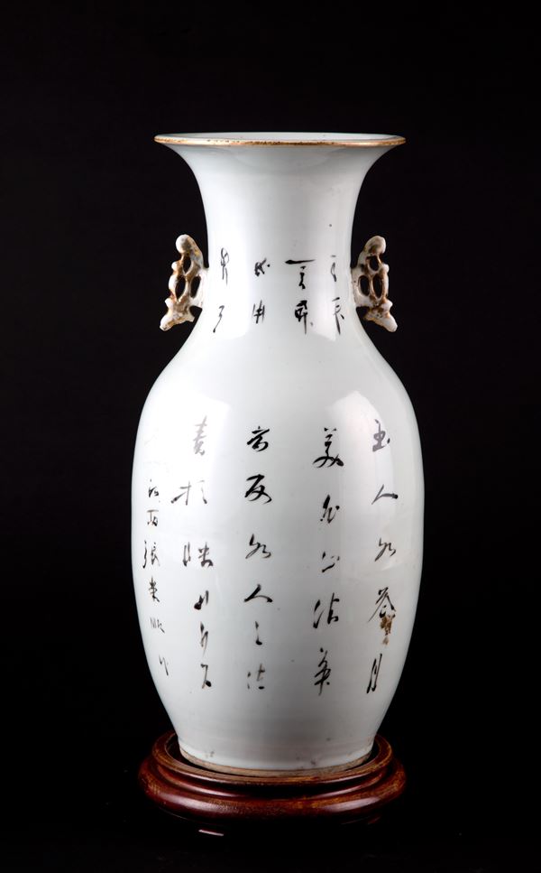 Vaso in porcellana bianca con scene di genere e scritte. Base in legno. Cina. Fine XIX secolo.