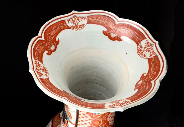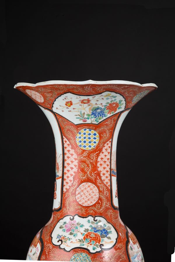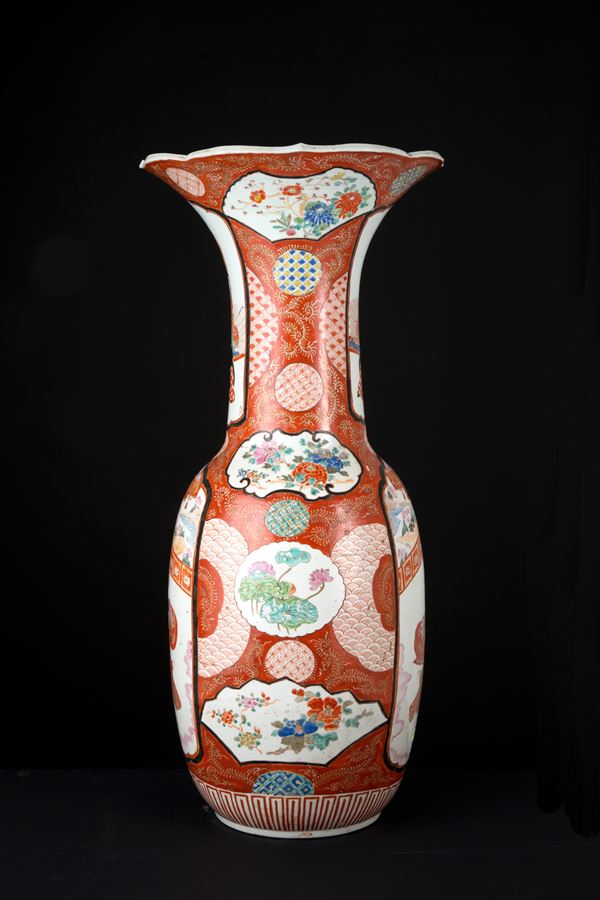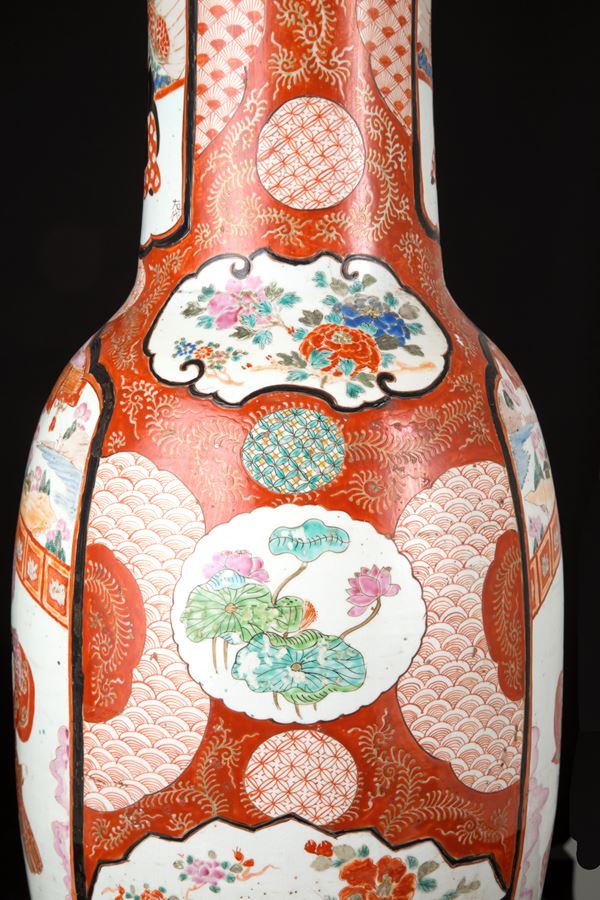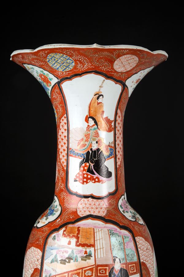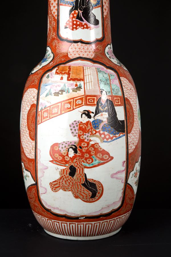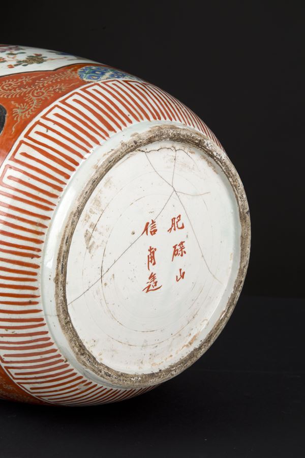 Vaso in porcellana policroma dipinta con scene di vita. Firmato in basso a destra in una delle due riserve sul collo. Marcato sul fondo. Giappone. Fine XIX-inizi XX secolo. Felatura sul fondo.