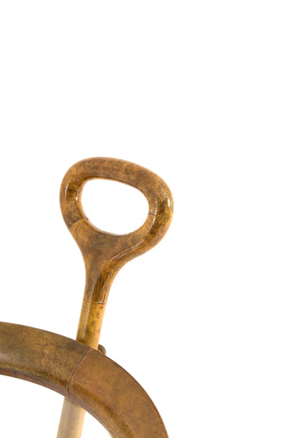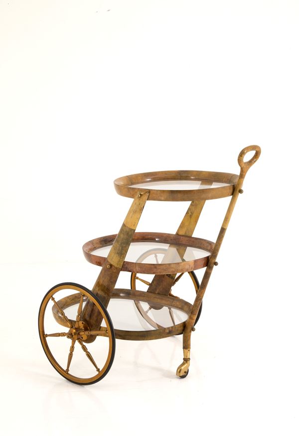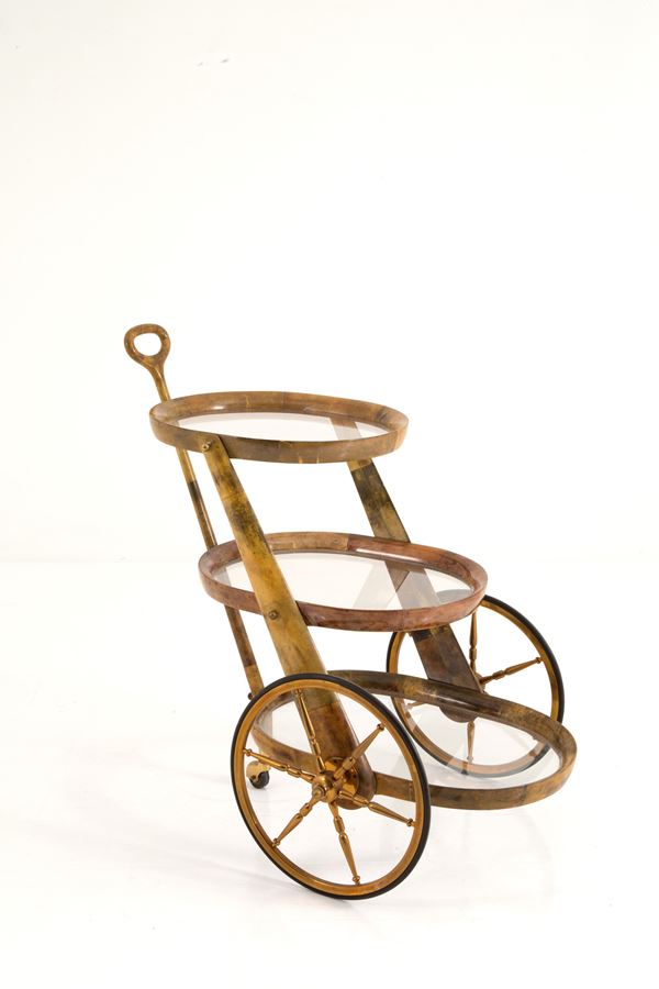 Carrello in legno curvato a vapore laccato a finta tartaruga con tre ripiani in vetro. Anni '70. Segni di usura del tempo.