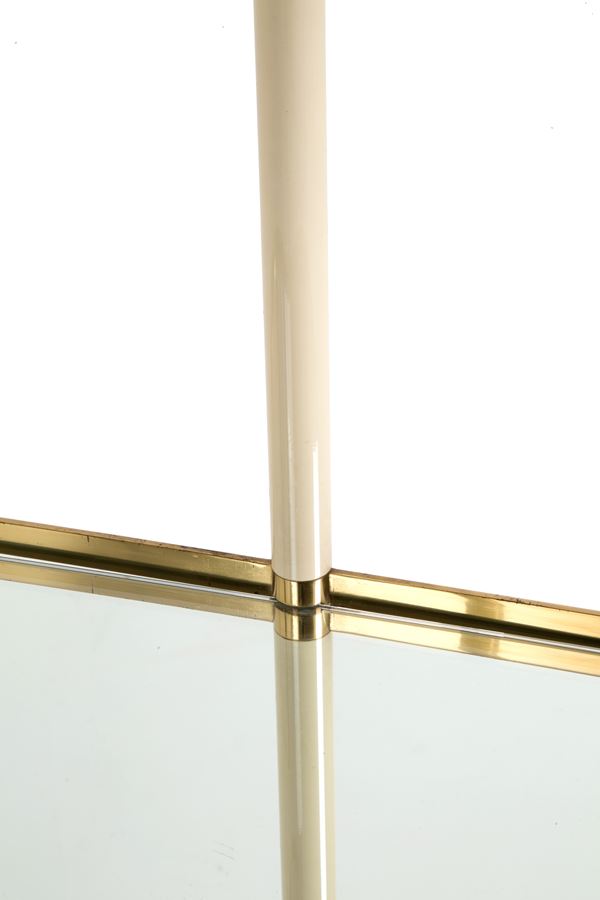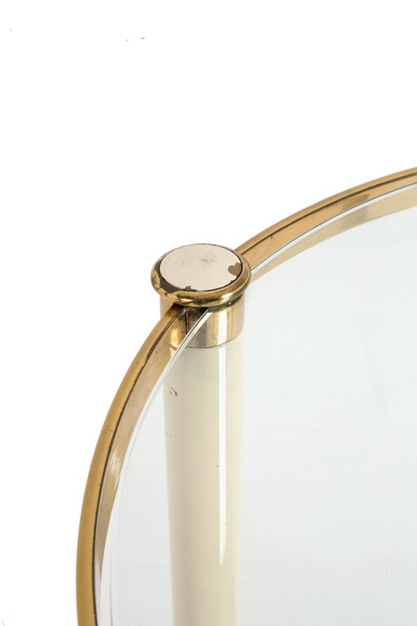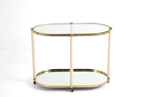 Carrello ovale in ottone e metallo smaltato bianco con ripiani in vetro e specchio. Anni '60. Difetti e segni di usura del tempo.