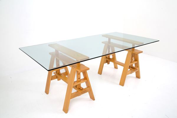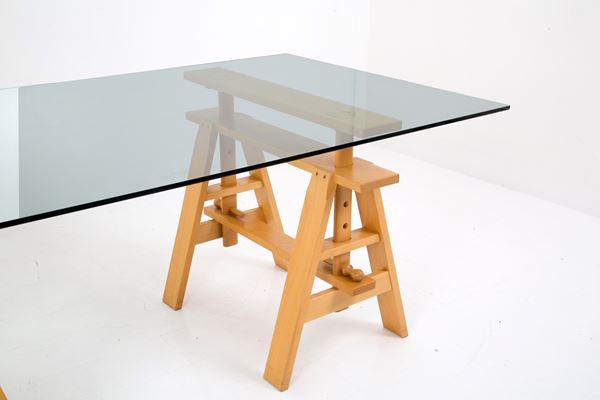 Tavolo Leonardo in legno di faggio con piano in cristallo temperato. Produzione ZANOTTA, 1968. Con marchio del produttore sopra i cavalletti. Altezza regolabile.
