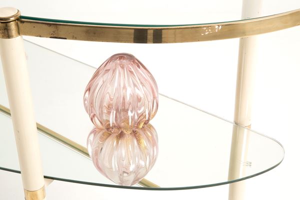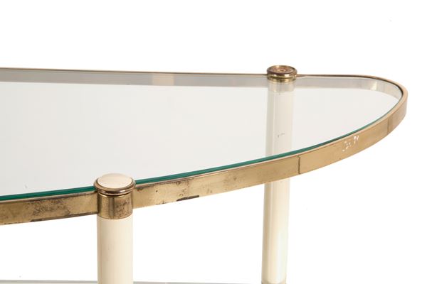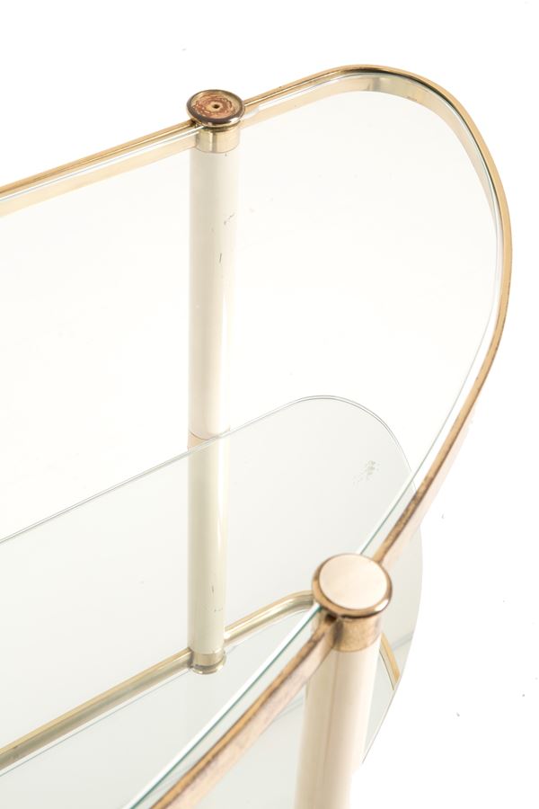 Consolle in ottone e metallo smaltato avorio con ripiani in vetro e specchio. Anni '60. Difetti e segni di usura del tempo. Mancante di una guarnizione in metallo smaltato.