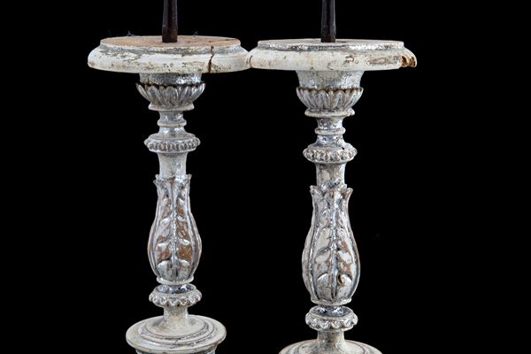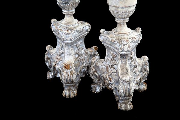 Coppia di candelieri in legno finemente intagliato con lumeggiature in argento. XVIII secolo. Difetti.