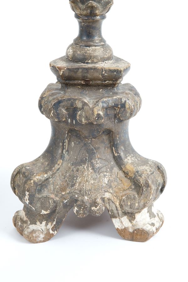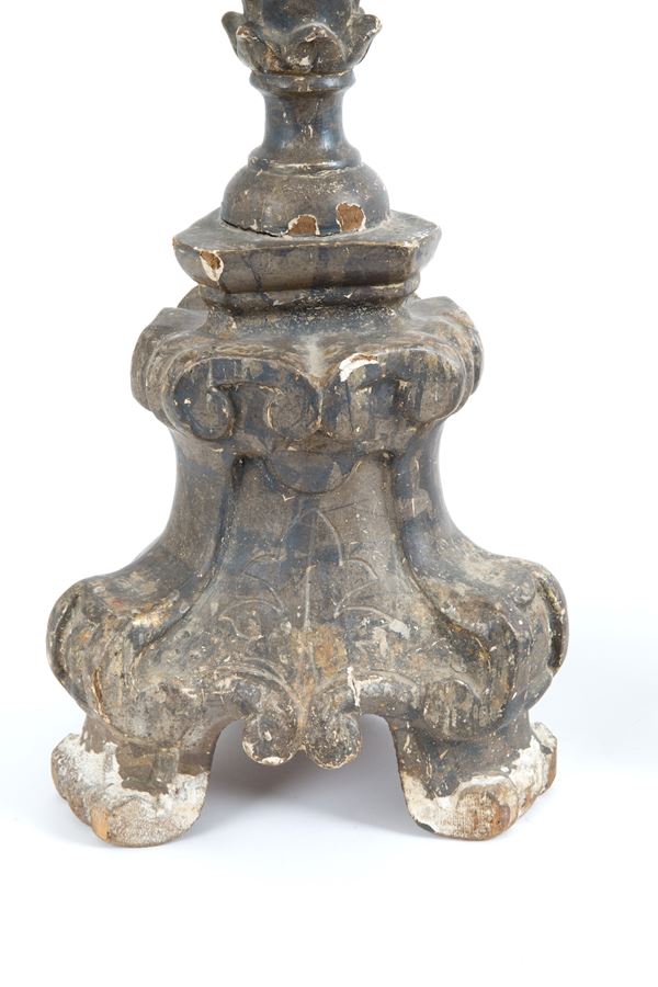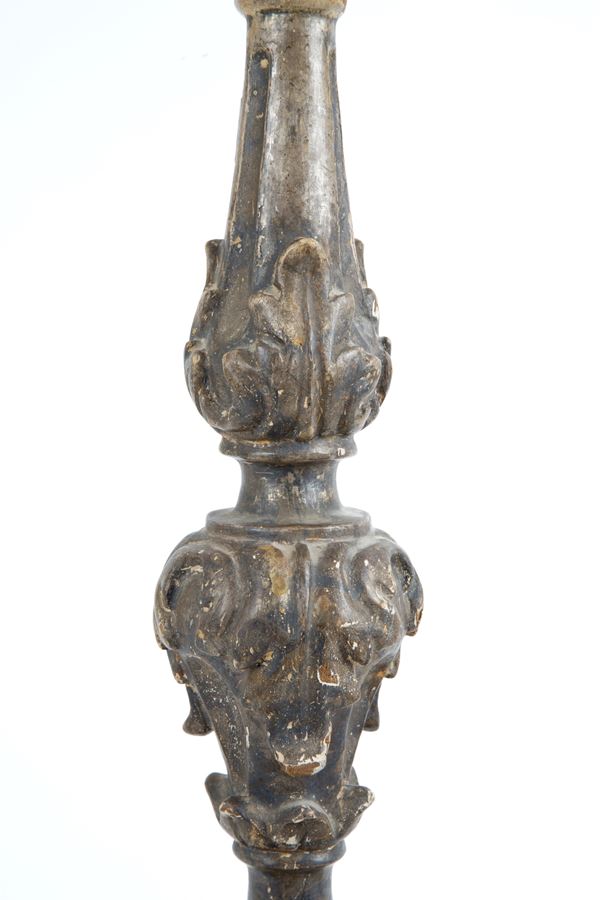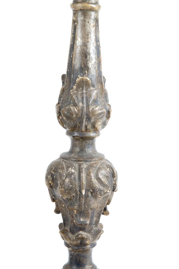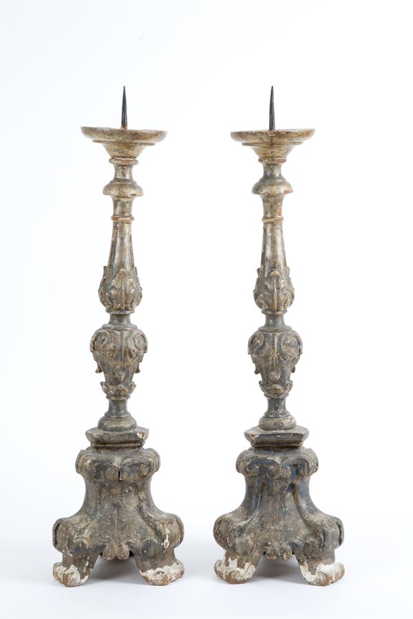 Coppia di candelieri in legno intagliato e argentato. XVIII secolo. Difetti.