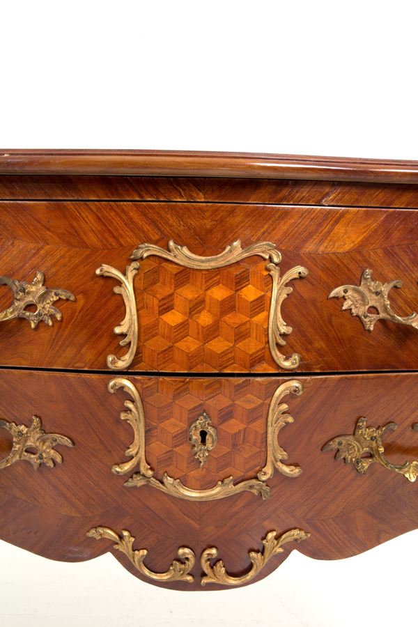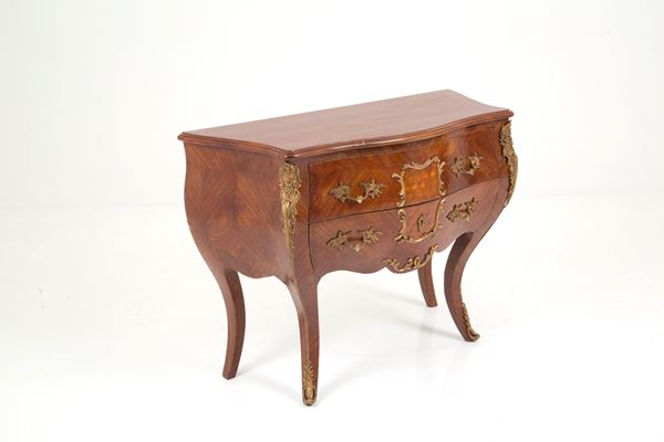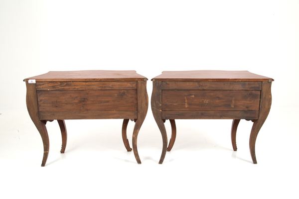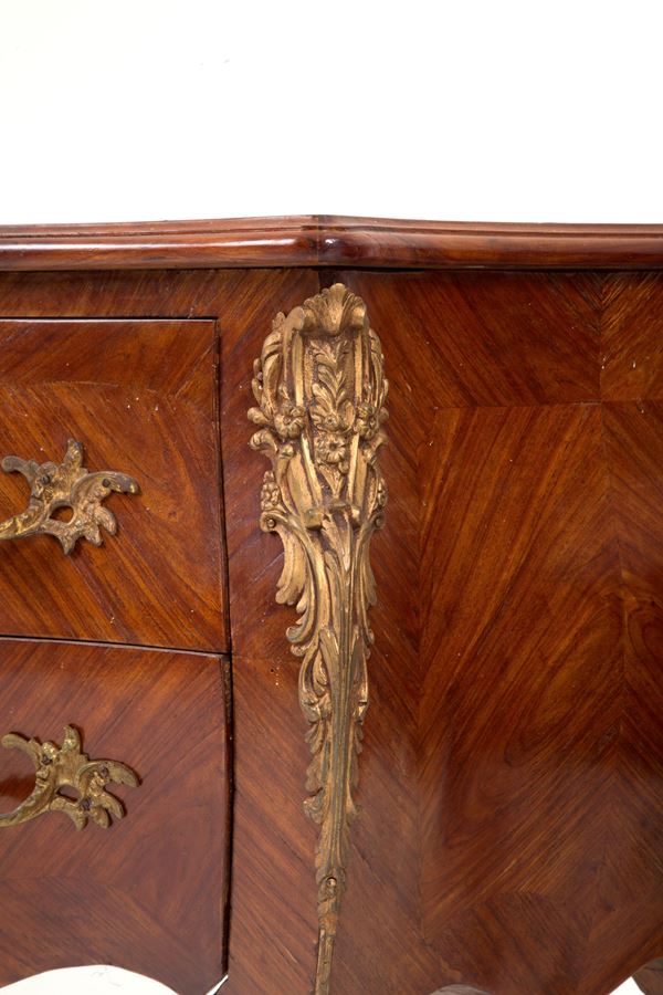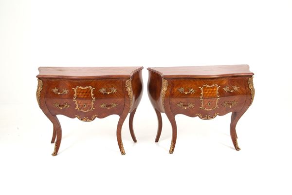 Coppia di comò mossi sul fronte e sui fianchi a due cassetti in legno lastronato con applicazioni in bronzo dorato. Stile Luigi XV. Difetti e usure del tempo.