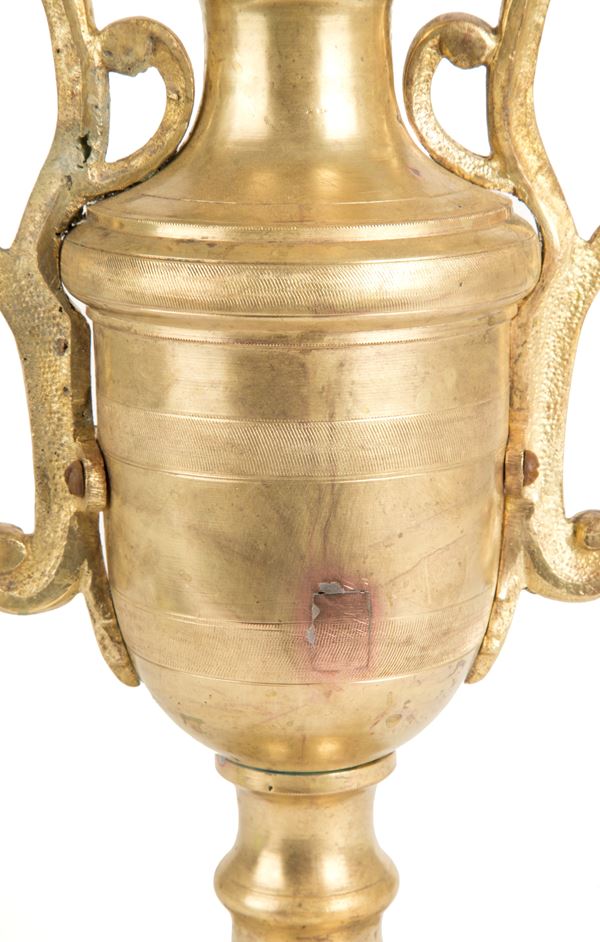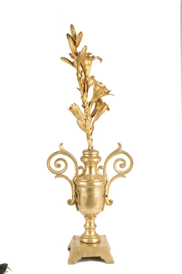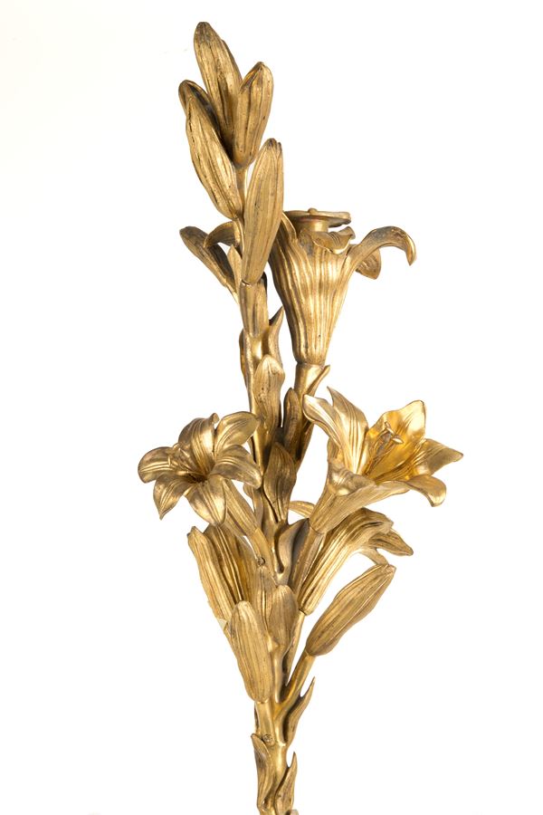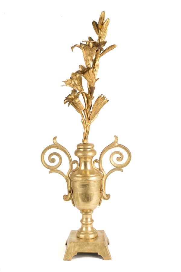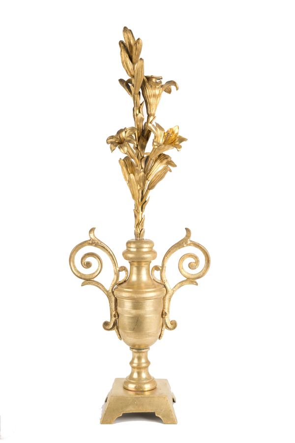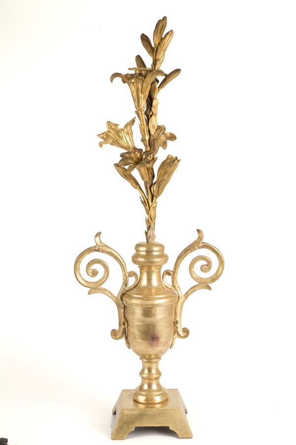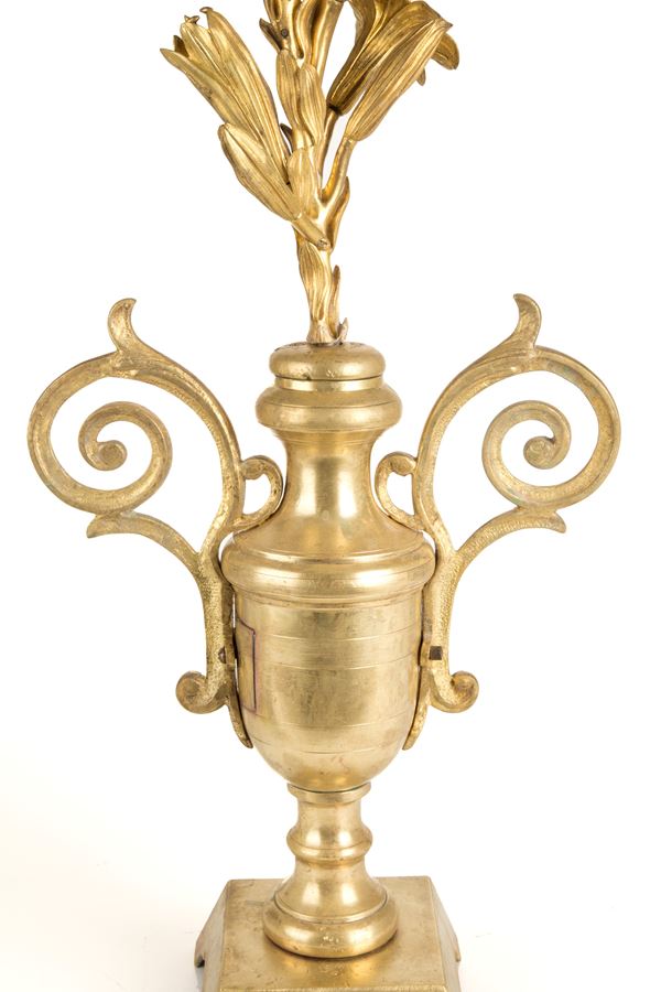 Coppia di elementi decorativi a motivi floreali in bronzo dorato montati su vasi. Fine XIX secolo. Piccoli difetti.