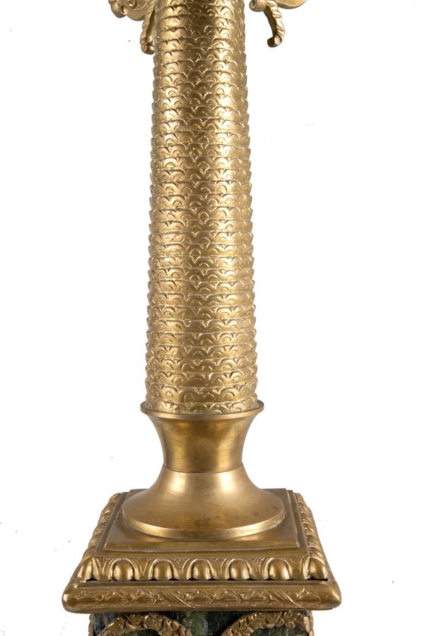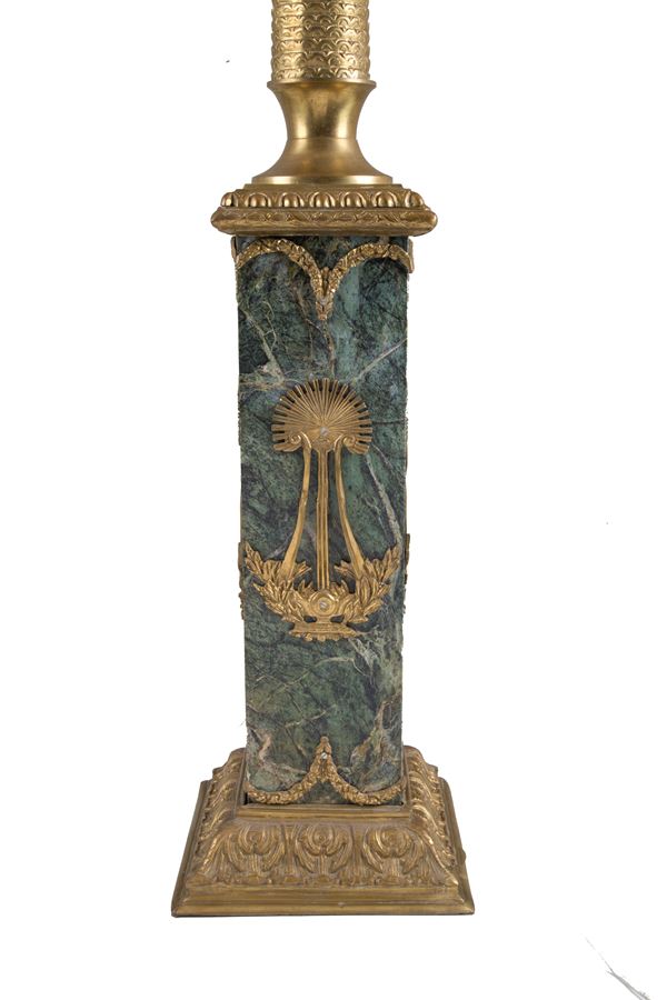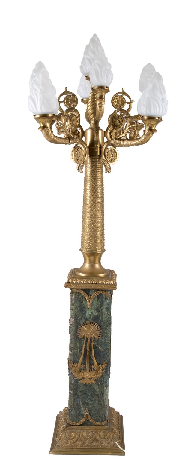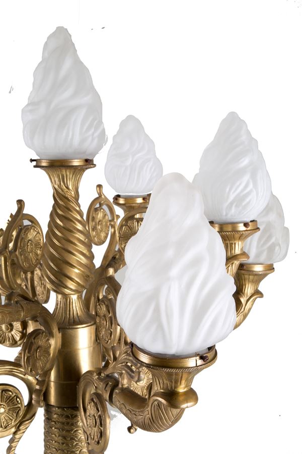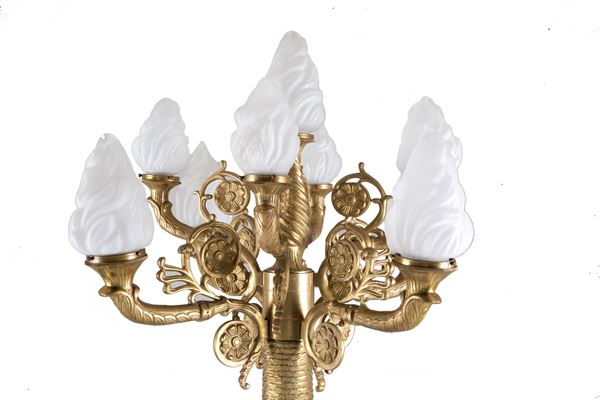 Coppia di grandi torcere a otto braccia in bronzo dorato su base in marmo verde con applicazioni in bronzo dorato. Fine XIX secolo. Usure del tempo.