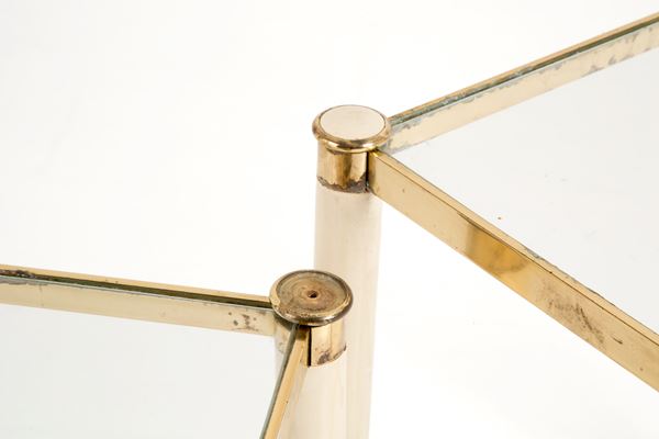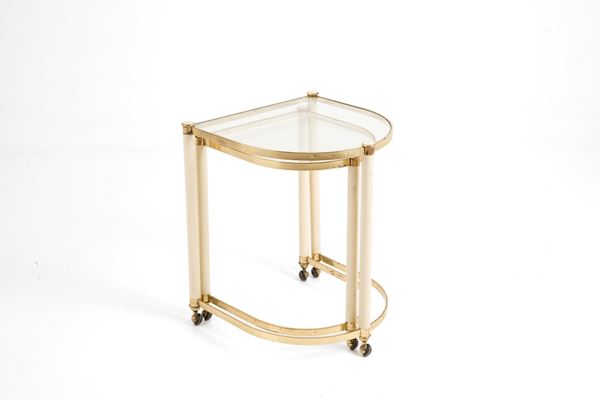 Coppia di tavolini a nido in vetro, ottone e metallo smaltato con rotelle. Anni '60. Difetti e segni di usura del tempo. Mancante di una guarnizione in metallo smaltato.