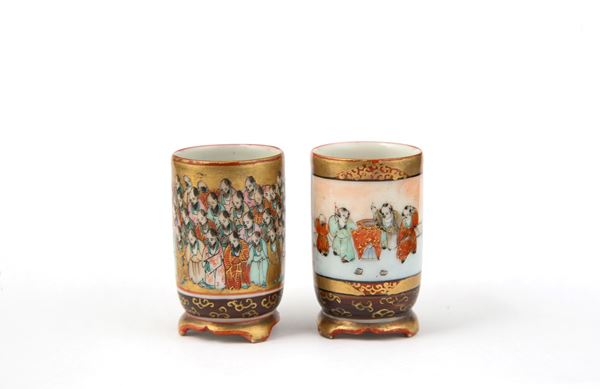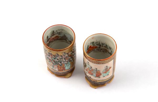 Coppia di vasetti in porcellana Satsuma dipinta con scene di vita orientale su fondo oro. Dipinti anche all'interno. Giappone. Fine XIX secolo.