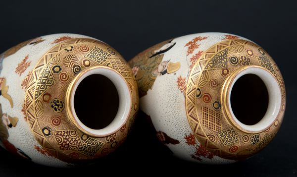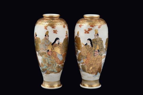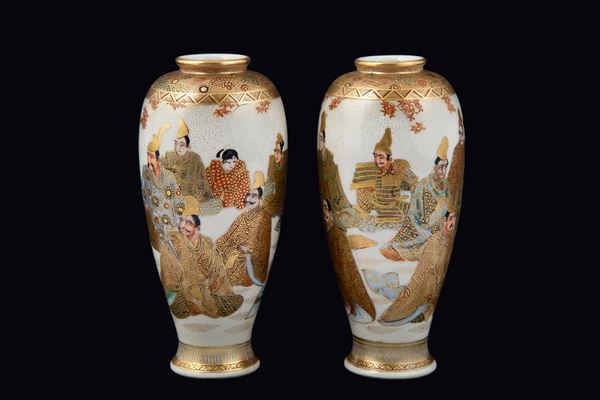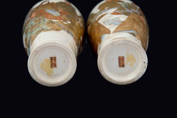 Coppia di vasetti in porcellana Satsuma dipinta con dignitari e decorati in oro zecchino. Marcati sul fondo. Giappone. Fine XIX secolo.