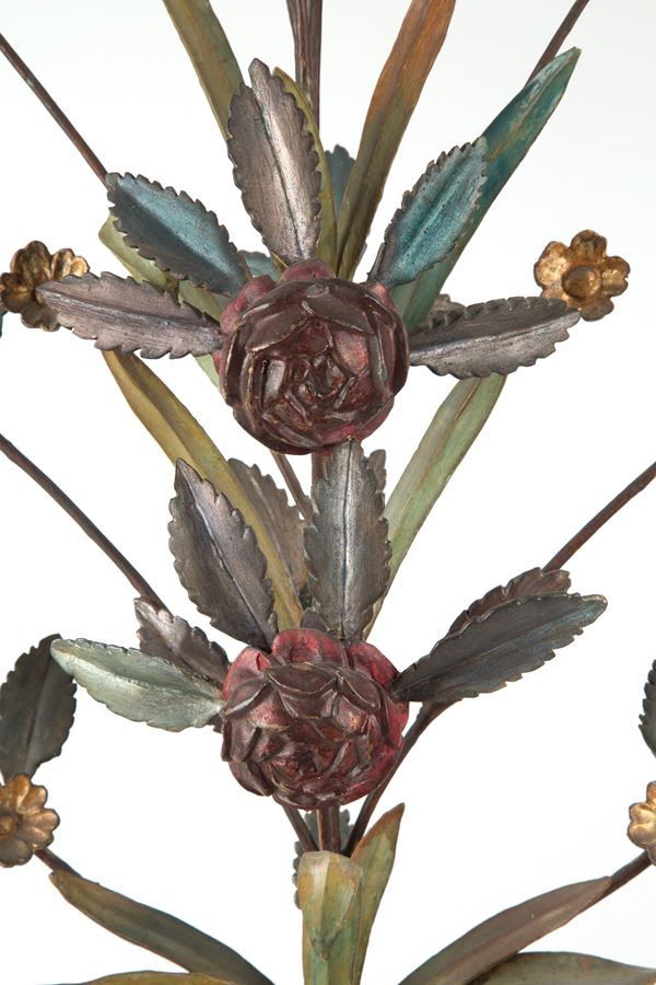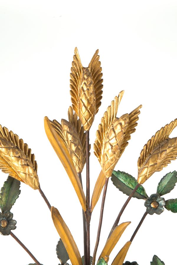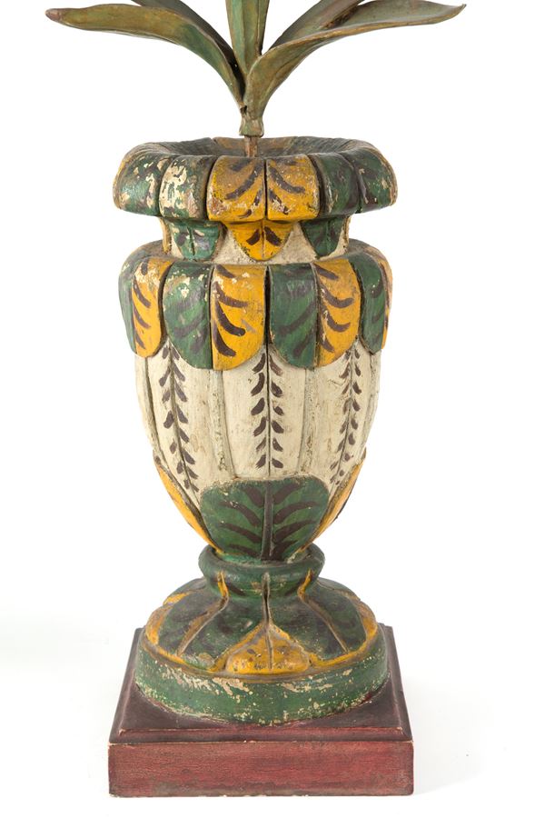 Coppia di vasi con decorazione floreale e palme in legno finemente intagliato, laccato e dorato. Inizi XIX secolo. Lievi difetti.