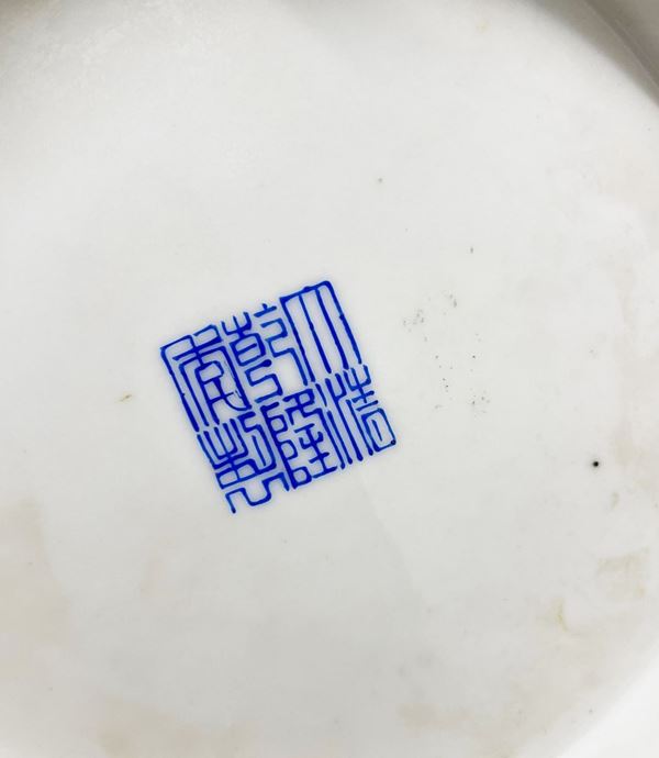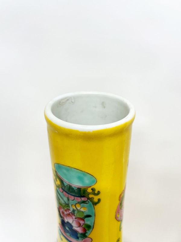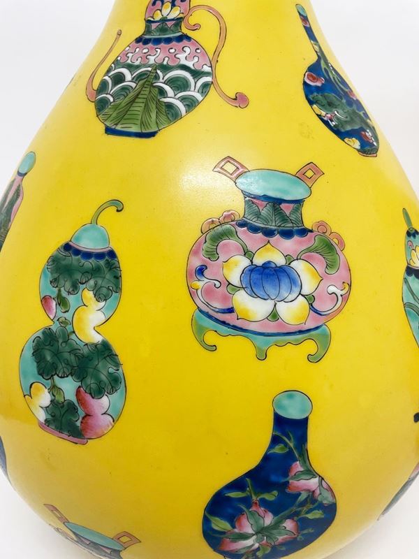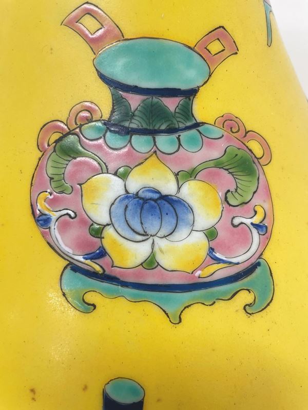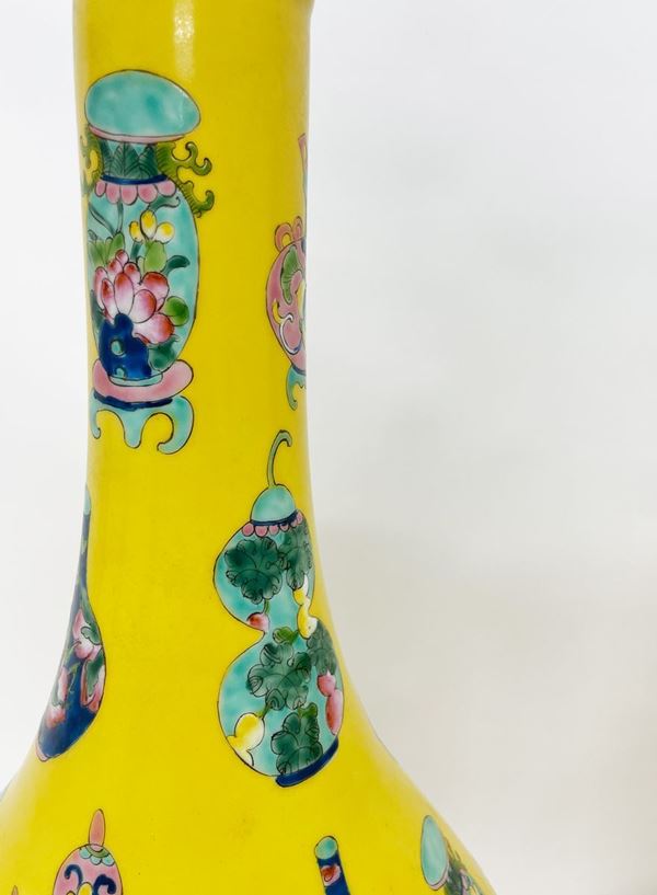 Coppia di vasi in porcellana Famiglia Rosa a fondo giallo. Cina. Con marchio apocrifo Qianlong.