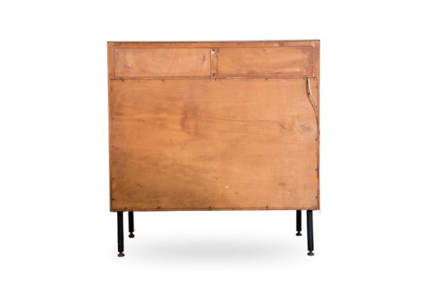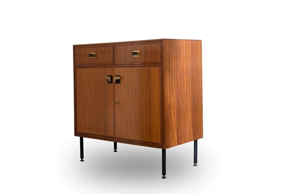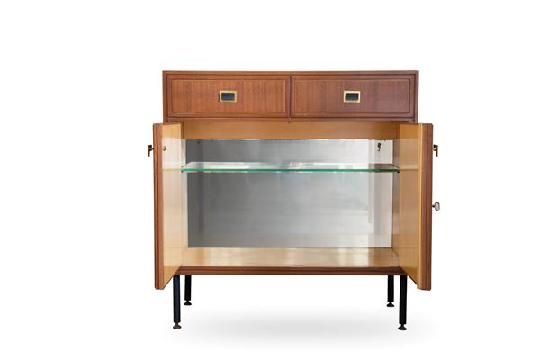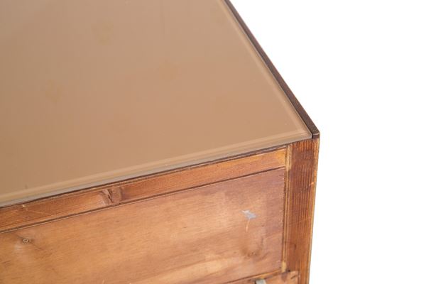 Credenzina in mogano con piano in vetro color nocciola a due cassetti e due sportelli con maniglie in bronzo dorato. Anni '70. Difetti.