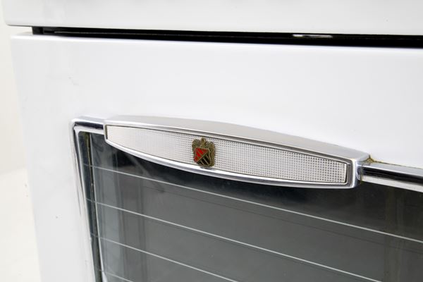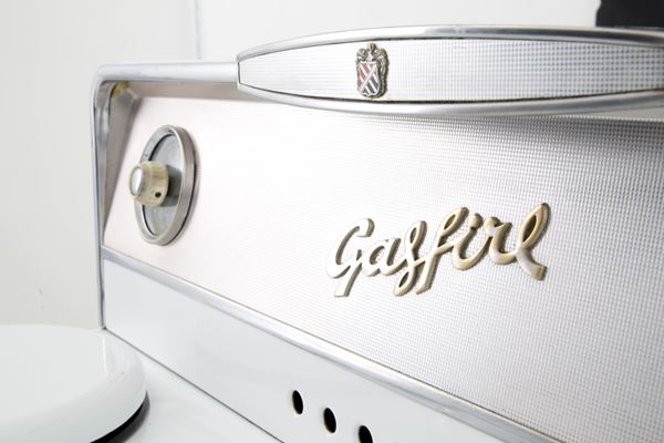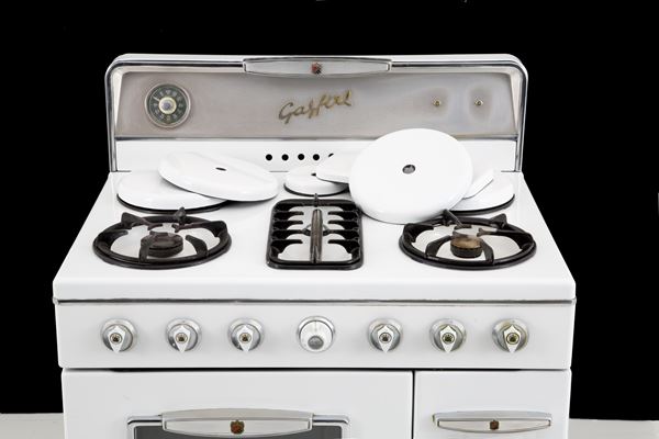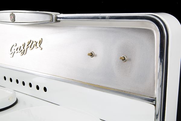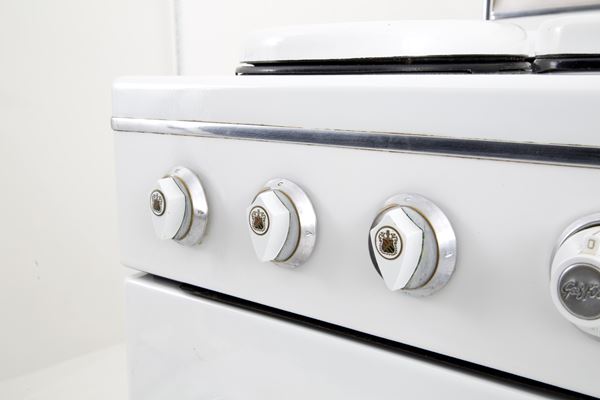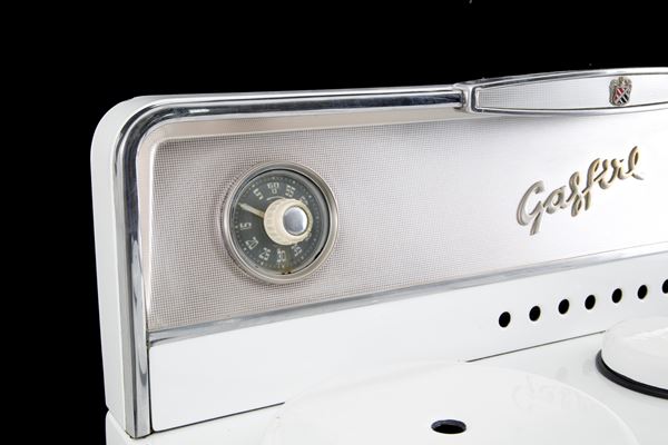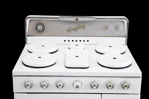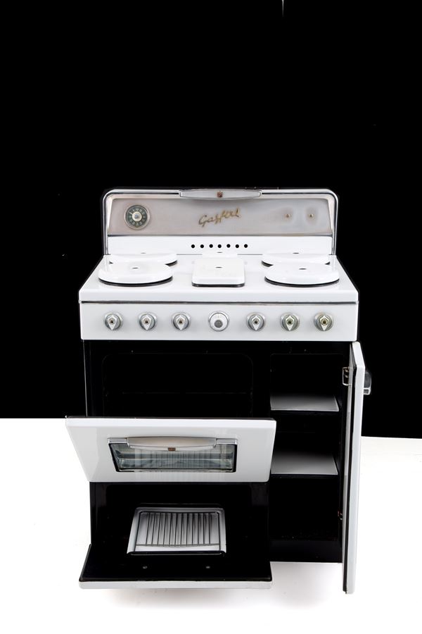 Cucina in metallo smaltato bianco e ghisa, con sei fuochi e relativi copri fornelli, un forno a gas, due antine contenitori e un timer. Produzione GASFIRE. Anni ‘50. Difetti e mancante delle manopole.