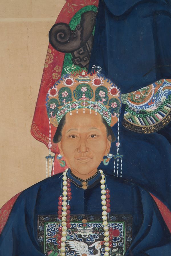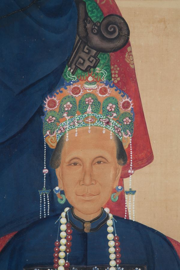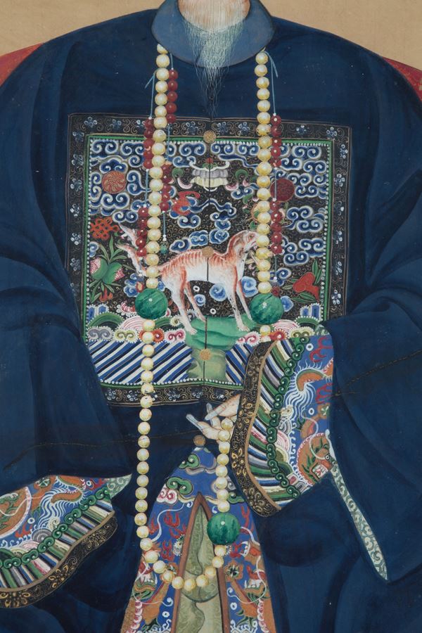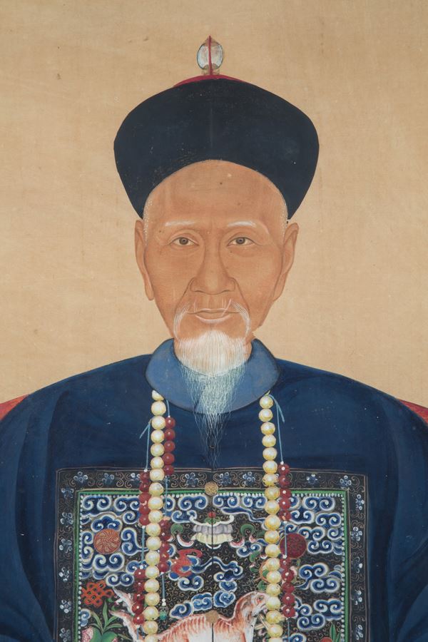 Dipinto tempera su carta di riso applicata su seta raffigurante "DIGNITARI". Cina. XIX secolo. Lievi difetti.