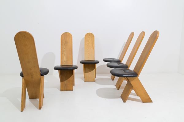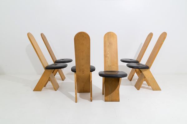 Sei sedie in legno con seduta in pelle nera. Anni '70. Difetti e segni di usura del tempo.