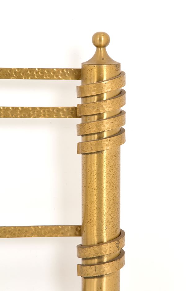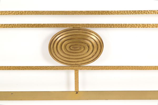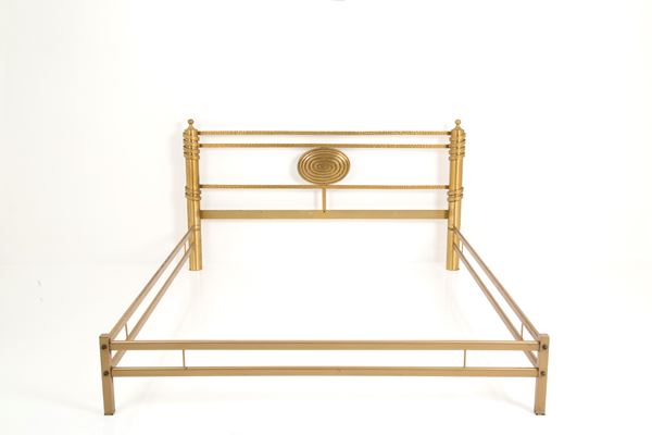 Letto matrimoniale in ottone martellato e dorato sulla testiera. Anni '70. Lievi segni di usura del tempo.