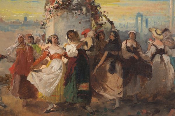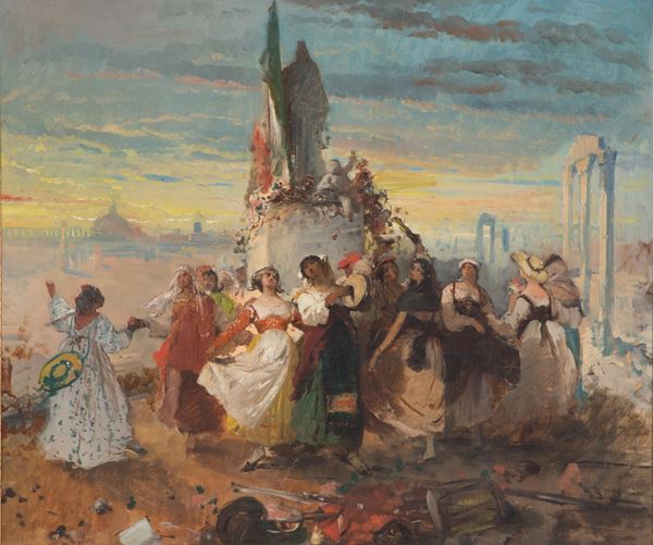 Dipinto olio su tela raffigurante "DANZA CAMPESTRE - ALLEGORIA UNITA' D'ITALIA". In cornice. Con lettera di attribuzione firmata dal Dott. Giorgio Nicodemi del 20.11.1963.