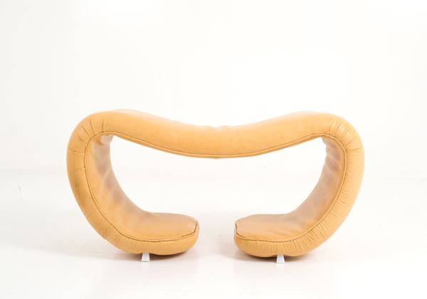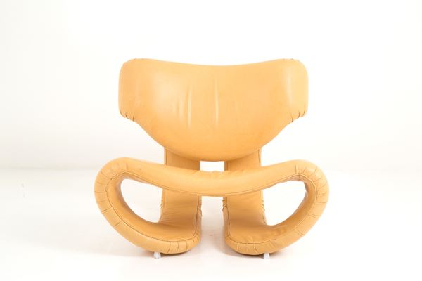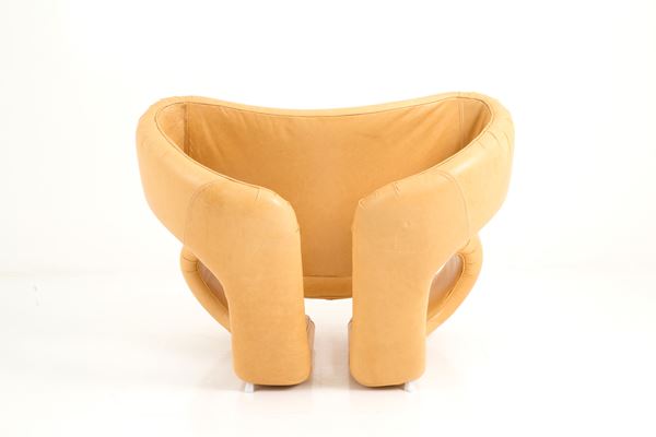 Poltrona Scultura 190 con poggiapiedi con struttura in ferro imbottita e rivestita in vinile ocra e piedini in materiale plastico. Produzione SAPORITI. Anni '70. Segni di usura del tempo.