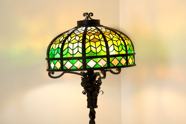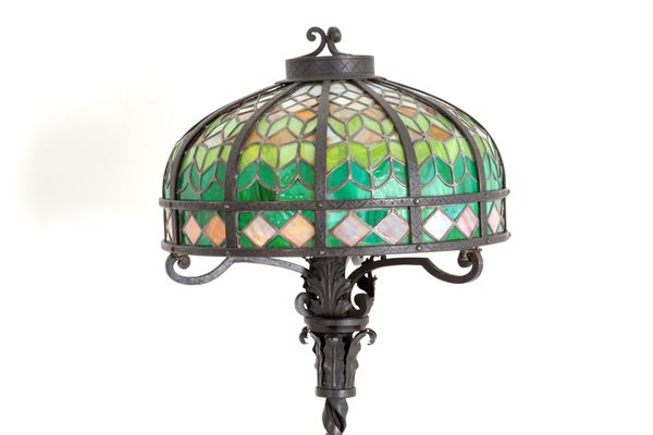 Lampada da terra in ferro battuto con paralume in vetro lavorato a piombo. Inizi XX secolo.