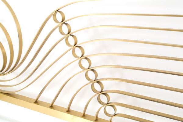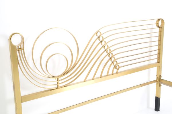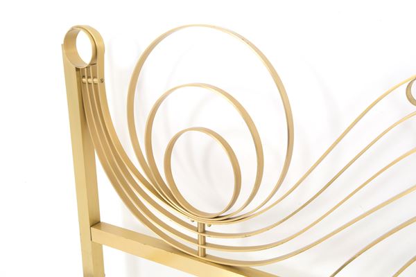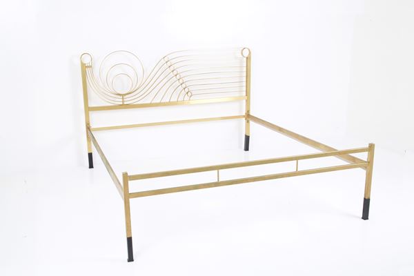Letto matrimoniale in ottone massiccio. Anni '70. Rialzi removibili. Difetto ad un piedino e segni di usura del tempo.