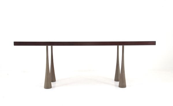 Tavolo con gambe in ghisa e piano in legno. Anni '70. Produzione SORGENTE DEL MOBILE CANTU'. Anni '70. Segni di usura del tempo.
