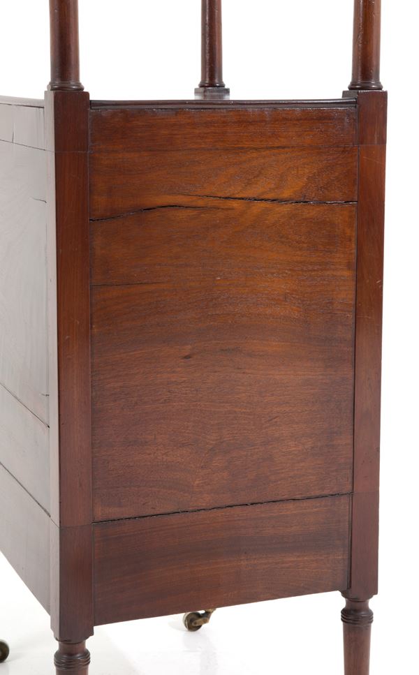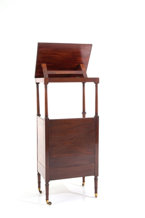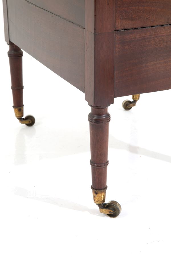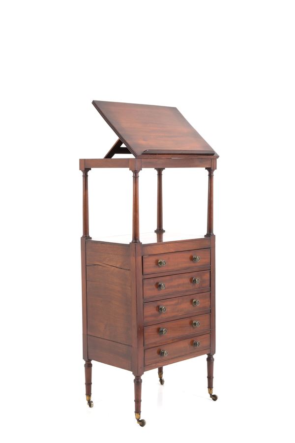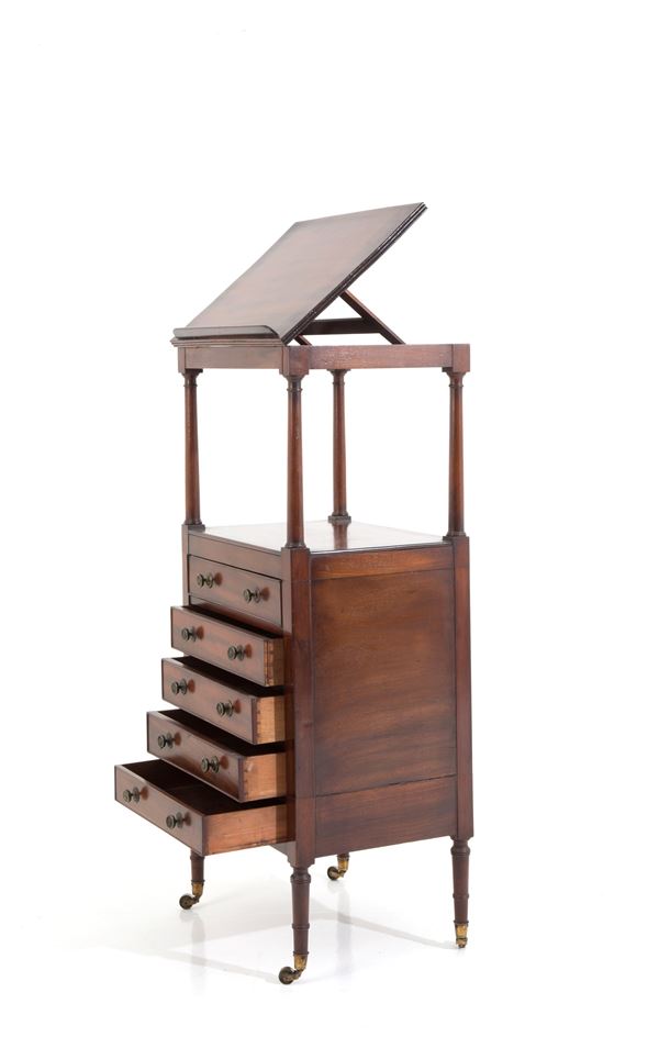 Mobiletto leggio da centro in mogano con cinque cassetti su rotelle. XIX secolo. Difetti e mancanze.