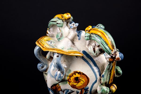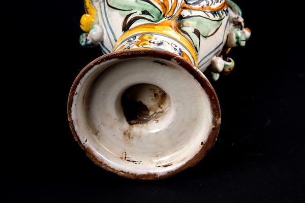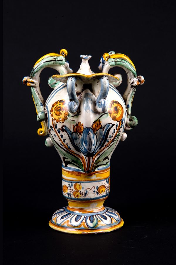 Orcio con manici in maiolica dipinta con stemma araldico. Faenza. Inizi XVII secolo.