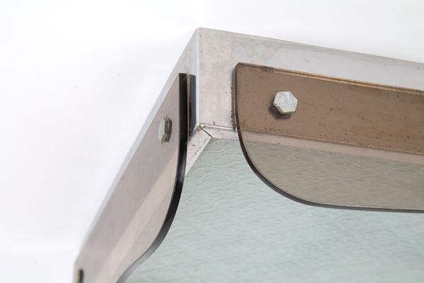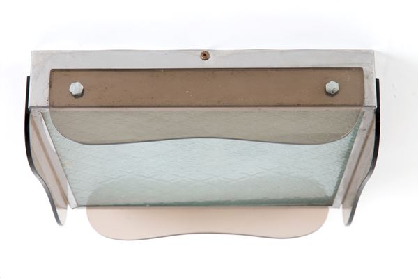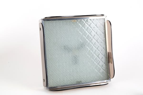 Plafoniera da incasso con struttura in metallo cromato, quattro vetri spessi laterali e vetro con decoro a rilievo al centro. Produzione VECA. Anni '60-'70. Segni di usure del tempo.