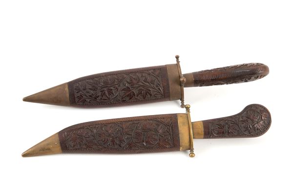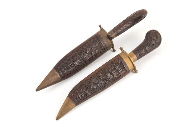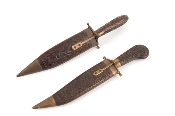 Coltello e forchetta per arrosto. In custodie di legno scolpito. Foresta Nera. Inizi XX secolo.