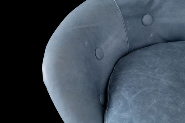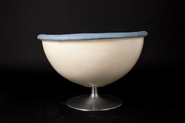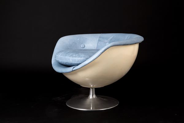 Quattro poltroncine modello P180 in alluminio e fibra di vetro bianca con rivestimento in pelle color carta da zucchero. Produzione RIMA. Anni '70. Segni di usura del tempo.