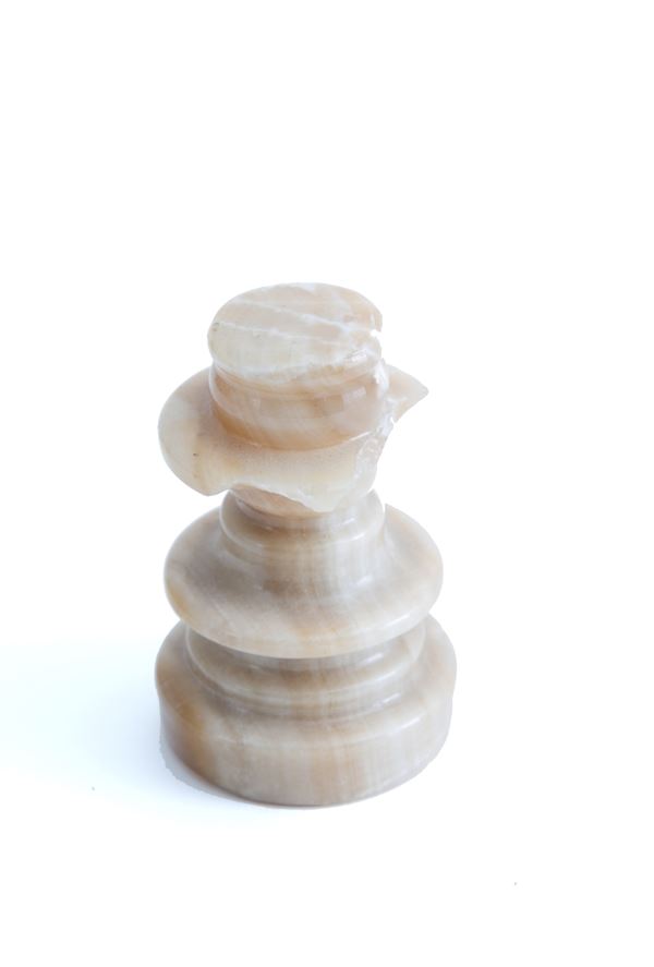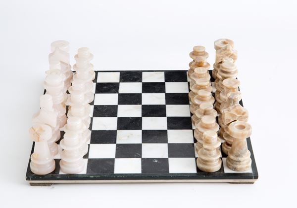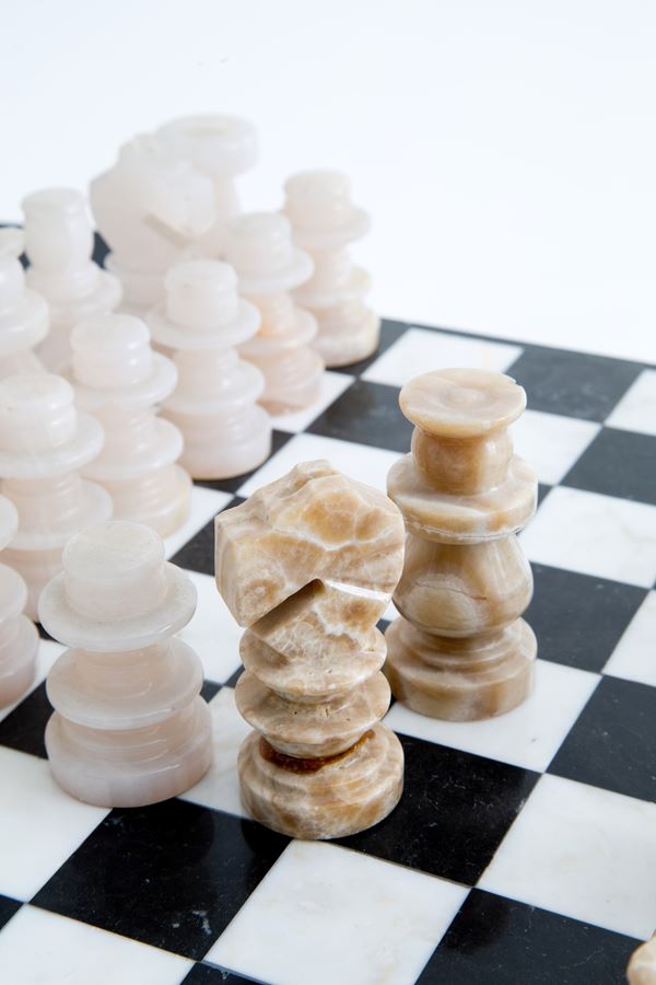 Scacchiera e pedine in onice. XX secolo. Difetti e mancanze.