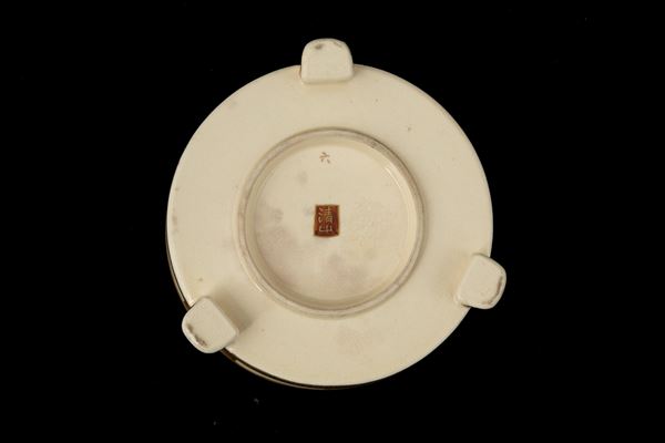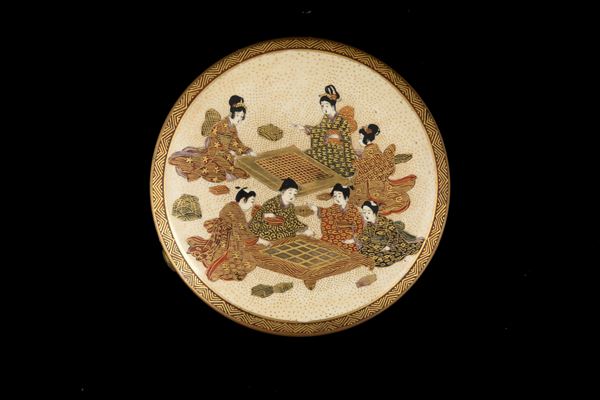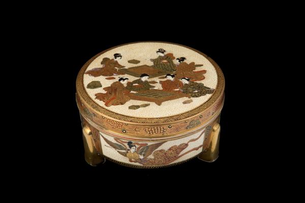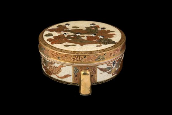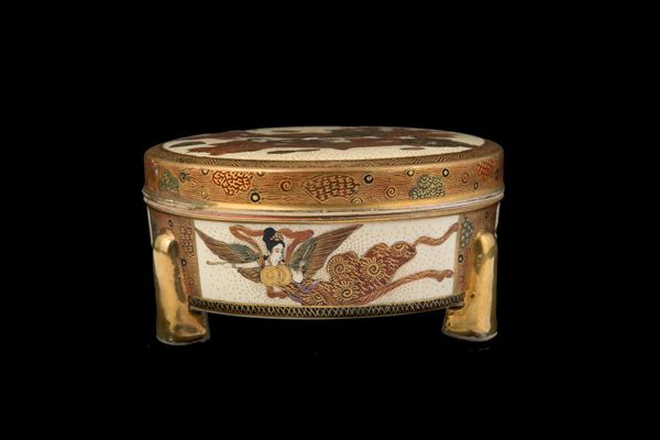 Scatola con coperchio in porcellana Satsuma dipinta con figure fantastiche e geishe. Marcata sotto la base. Giappone. Fine XIX secolo. Piccolo difetto alla bordura.