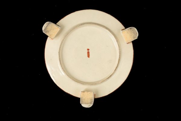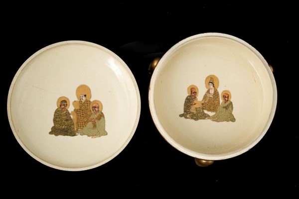 Scatola con coperchio in porcellana Satsuma dipinta e decorata in oro zecchino con figure fantastiche e dignitari. Marcata sul fondo. Giappone. XIX secolo.