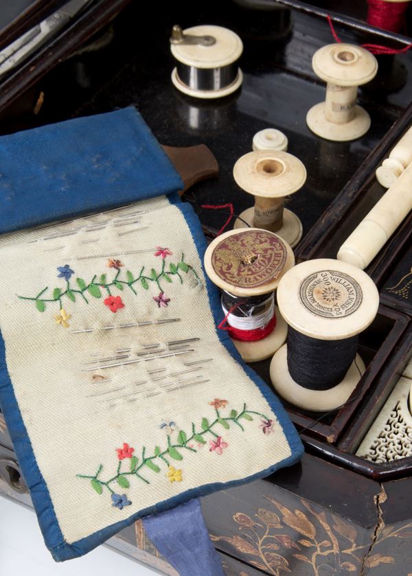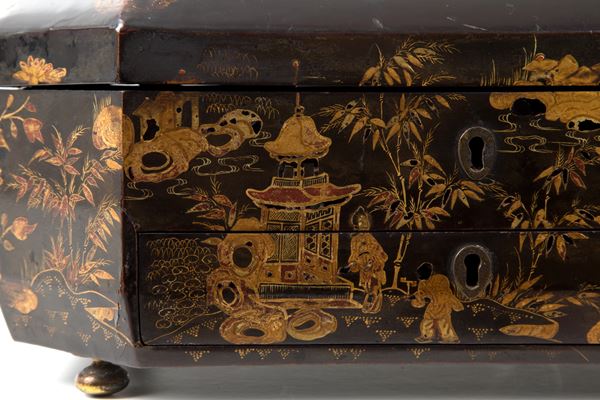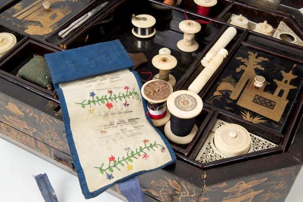 Scatola da cucito in legno laccato e dorato con scomparti all'interno. Cina. XIX secolo. Lievi difetti.