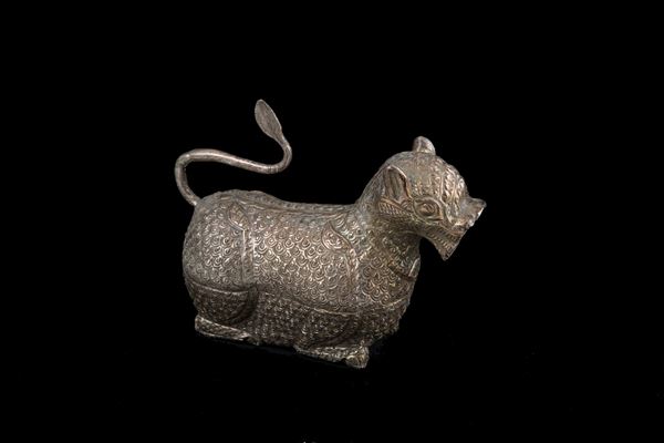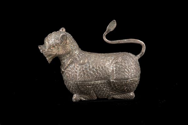Scatola porta noci di Betel di animale fantastico in metallo finemente sbalzato, cesellato e argentato. Cambogia. XIX secolo.