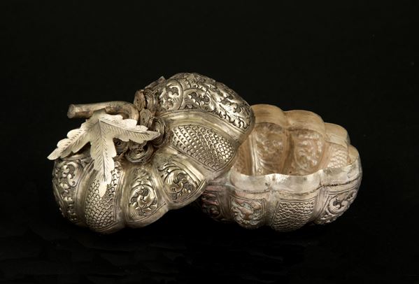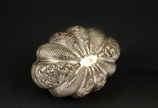 Scatola porta noci di Betel a forma di frutto in rame finemente sbalzato, cesellato e argentato. Cambogia. XIX secolo.