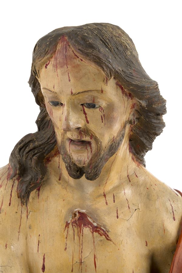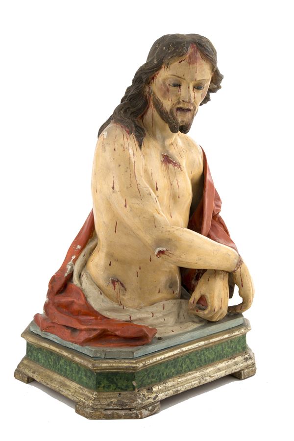 Scultura in papier-maché raffigurante "ECCE HOMO". Base in legno. Inizi XVIII secolo.