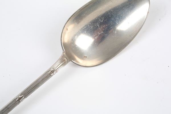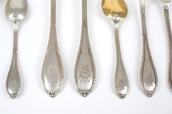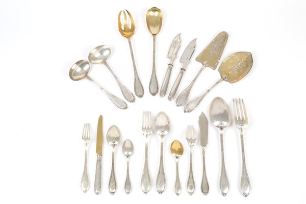 Servizio di posate in argento 800 composto da diciassette forchette grandi, undici cucchiai grandi, undici coltelli, dodici forchette medie, undici cucchiai medi, dodici coltelli e undici forchette da pesce, undici cucchiai da dolce, undici cucchiai da caffè, due coltelli da formaggio, due mestoli, due posate grandi da insalata, un forchettone, un cucchiaio grande e due palette da dolce, gr. 6457 ca. complessivi (coltelli esclusi).